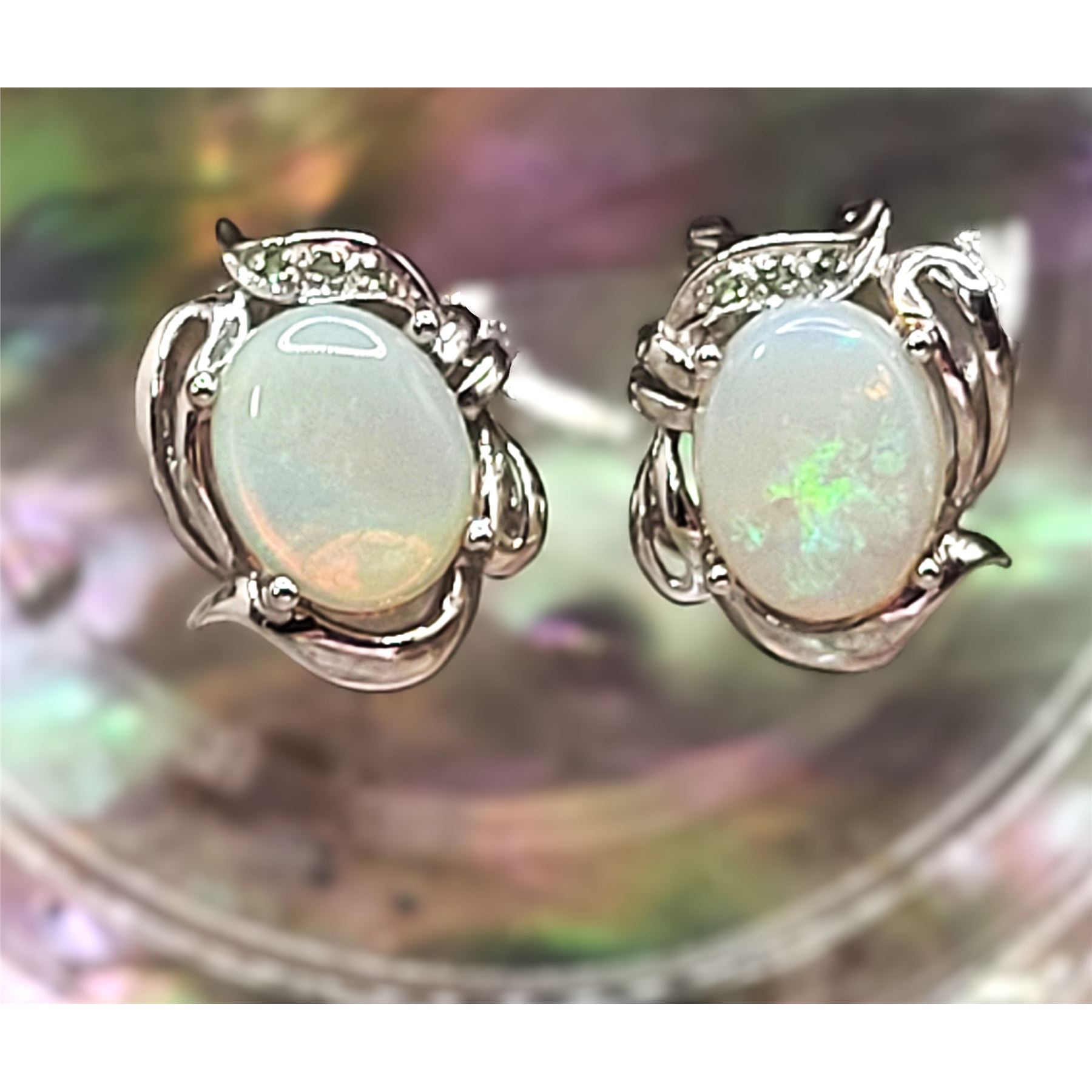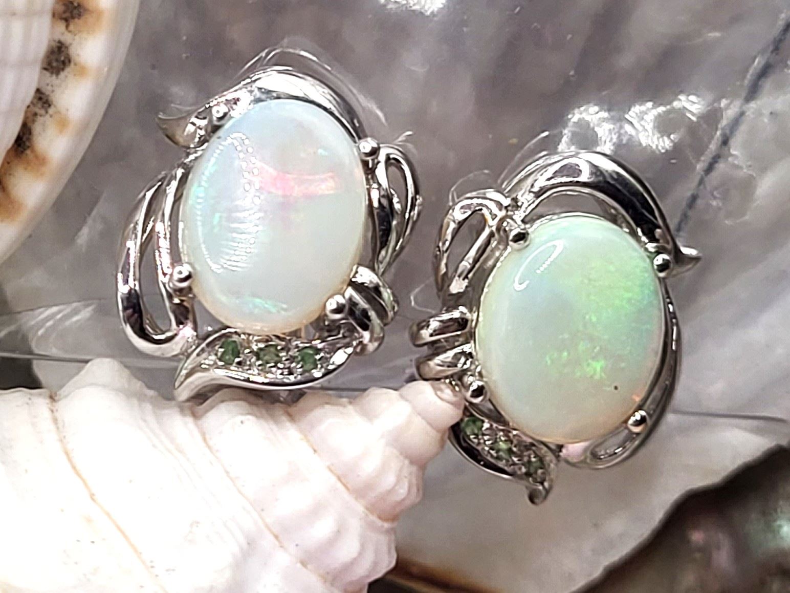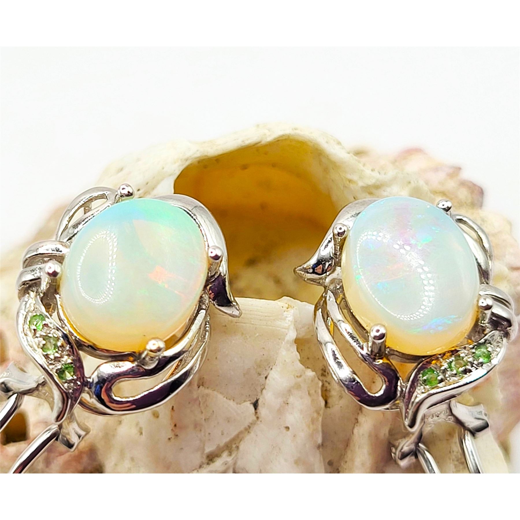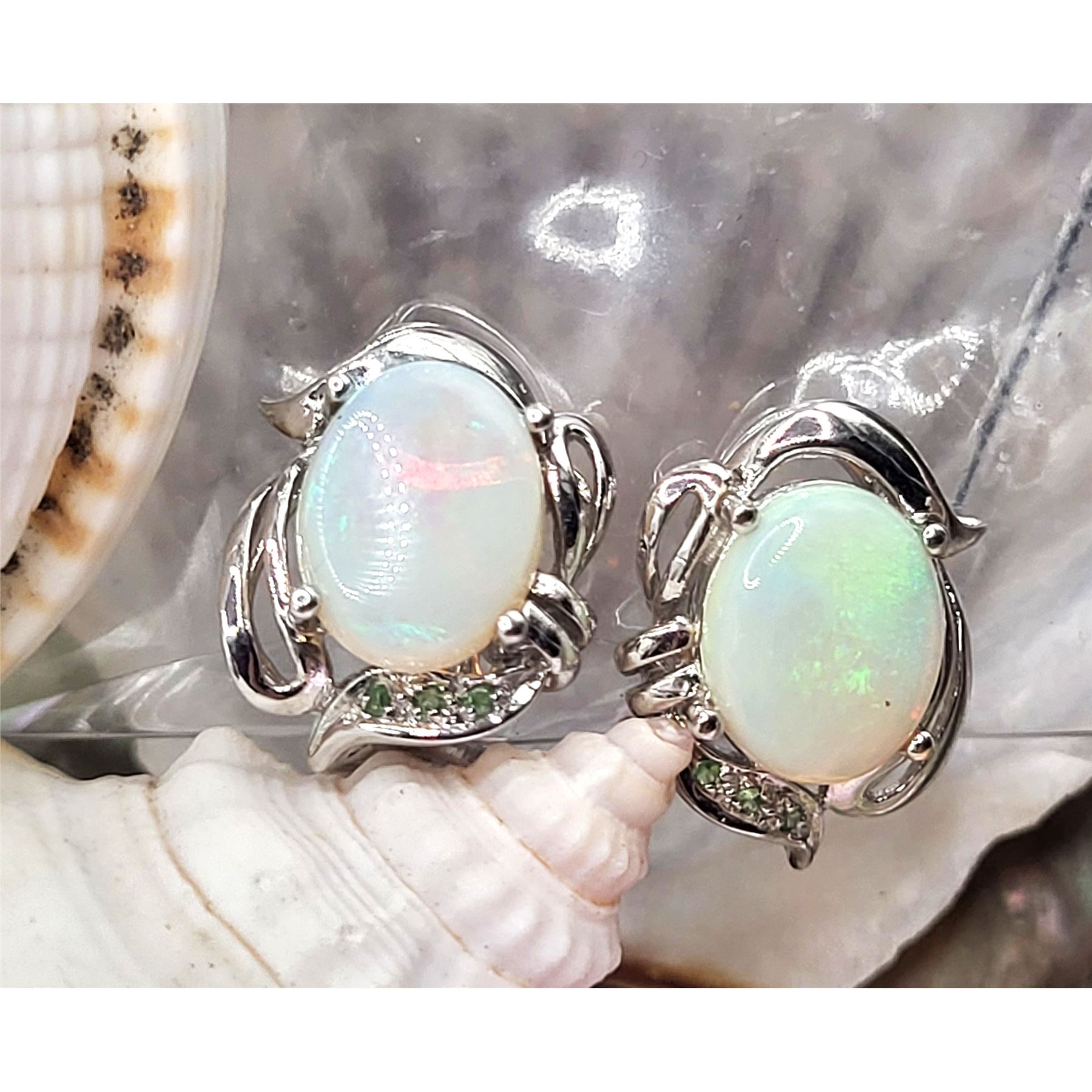 This is a pair of 14 karat white gold earrings that feature approximately 3.00 carats total weight of natural white opals with blue broadflash. The opals are accented with approximately .03 carats total weight, round, faceted, genuine, green tsavorite garnets.& nbsp; These are a gem collector's delight! The gemstones are set into graceful, swirling frames and the earrings attach to the earlobe with posts and exclusive Omega backs.& nbsp; Admin: 33110/29lnt