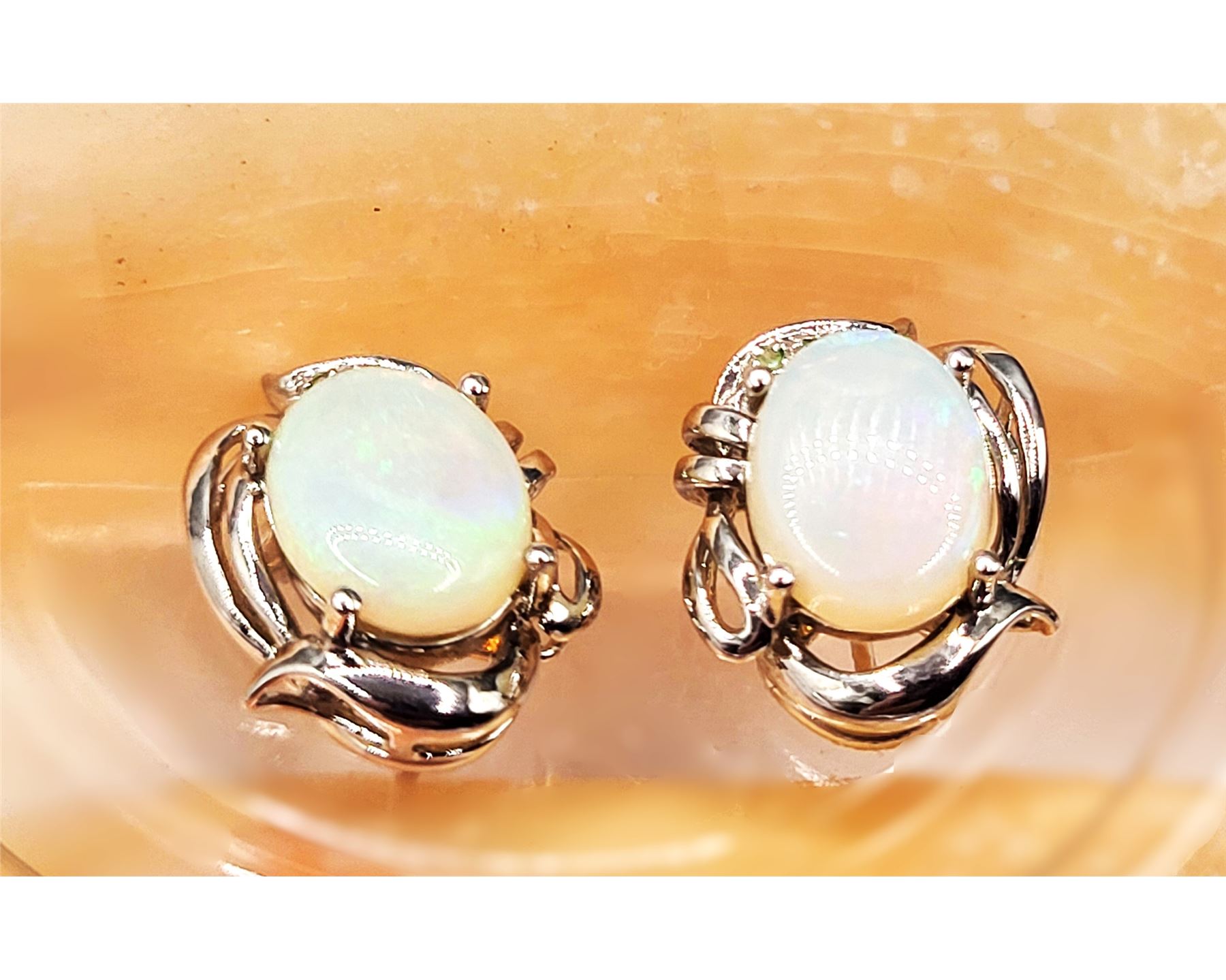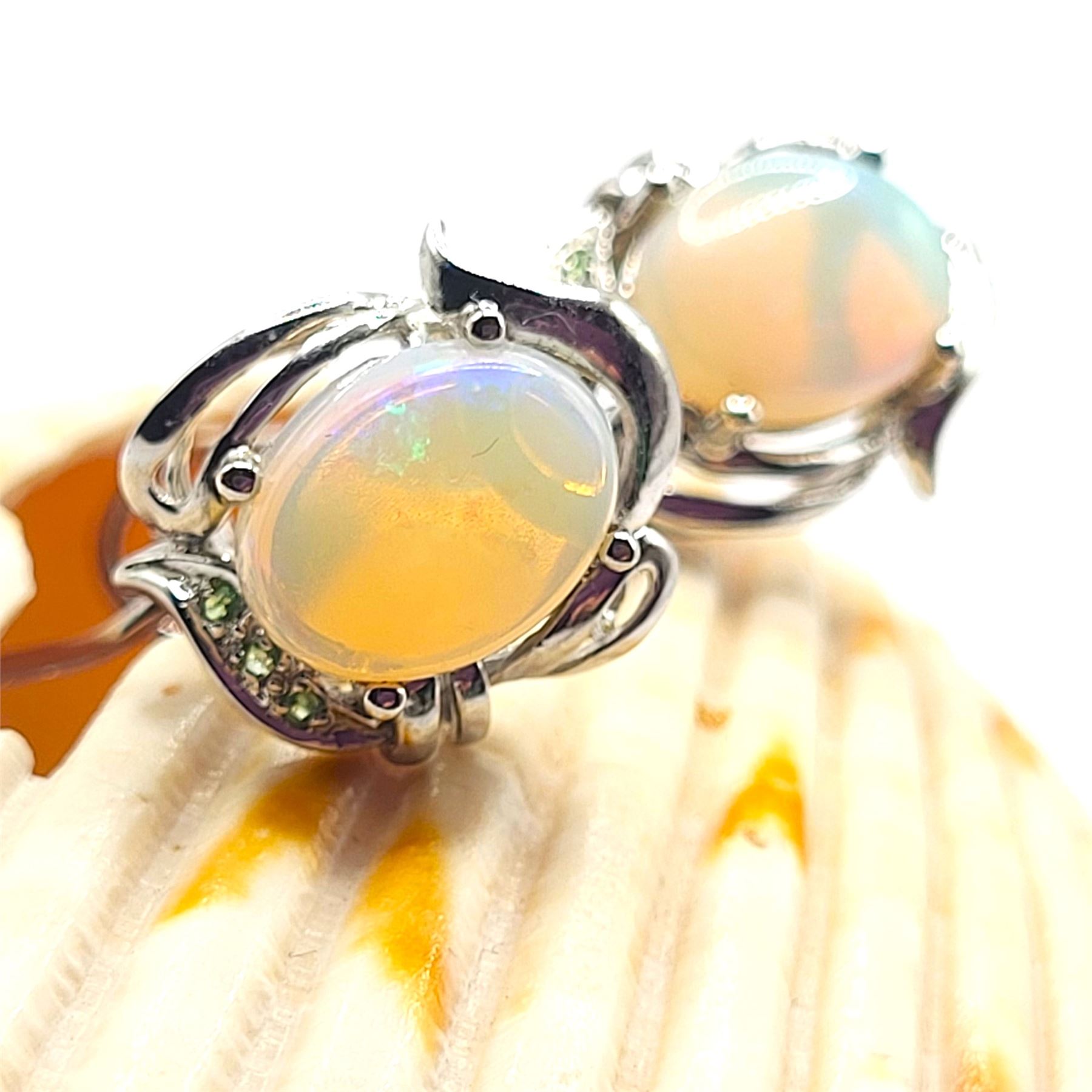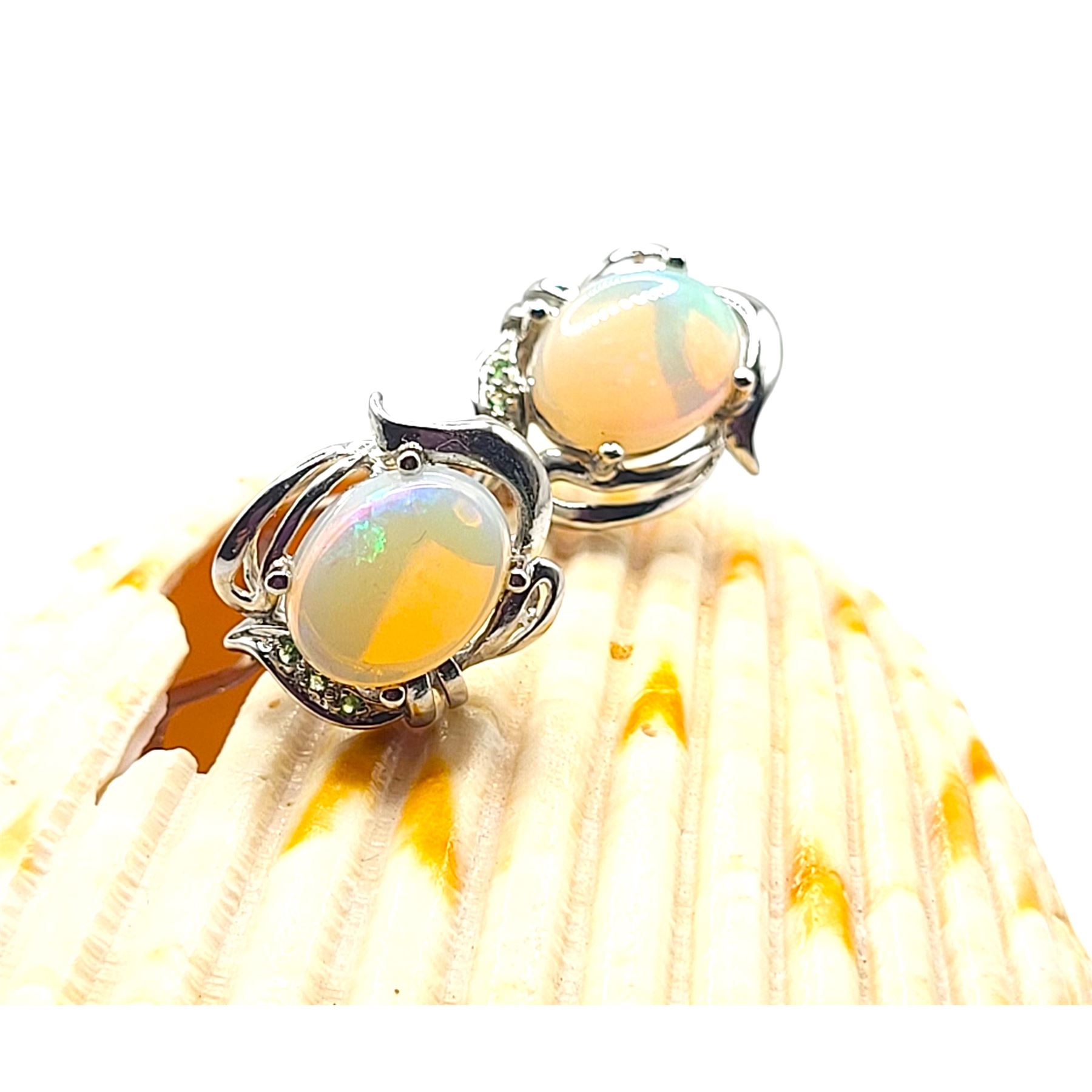 This is a pair of 14 karat white gold earrings that feature approximately 3.00 carats total weight of natural white opals with blue broadflash. The opals are accented with approximately .03 carats total weight, round, faceted, genuine, green tsavorite garnets.& nbsp; These are a gem collector's delight! The gemstones are set into graceful, swirling frames and the earrings attach to the earlobe with posts and exclusive Omega backs.& nbsp; Admin: 33110/29lnt