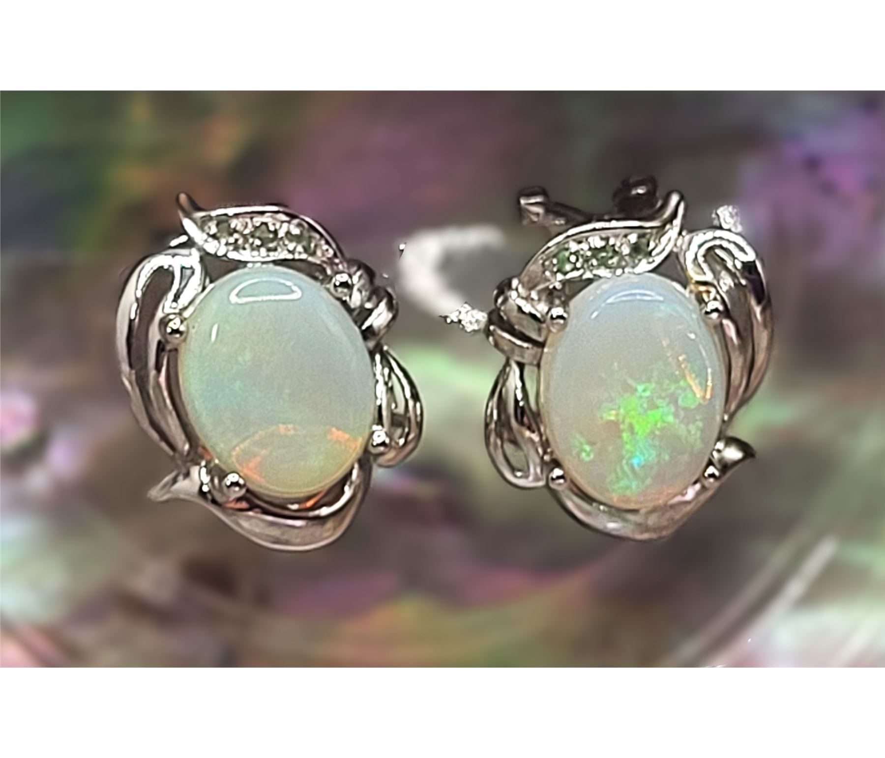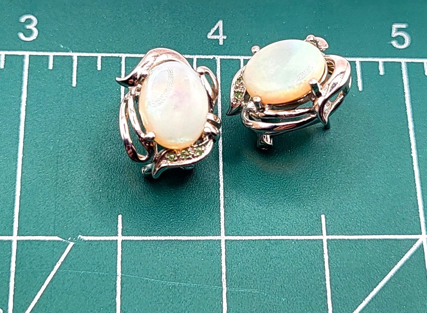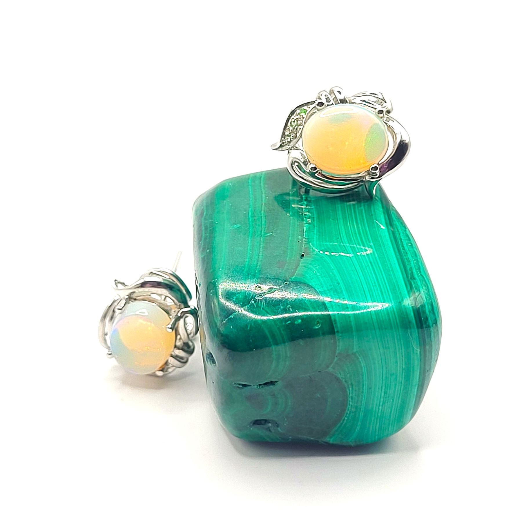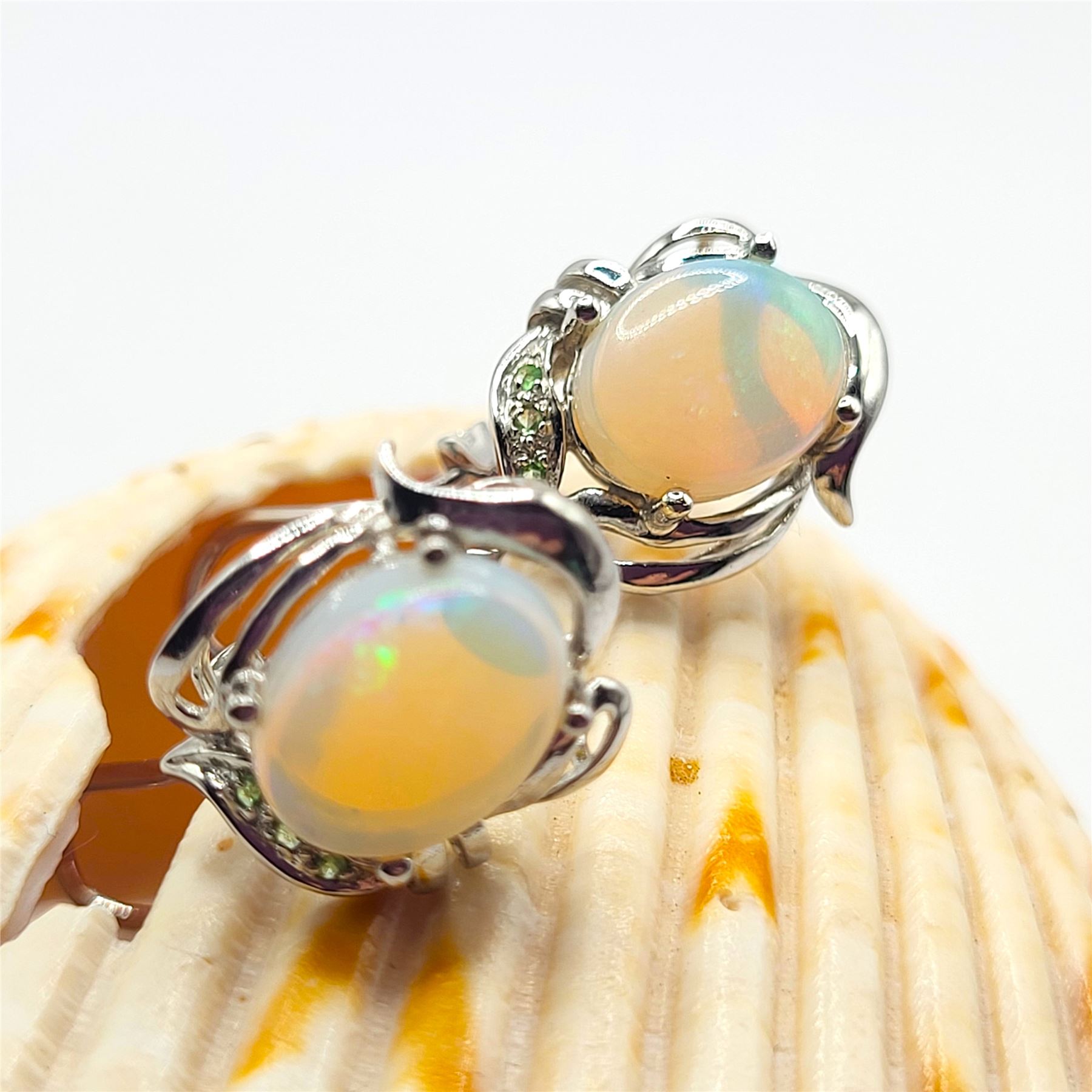 This is a pair of 14 karat white gold earrings that feature approximately 3.00 carats total weight of natural white opals with blue broadflash. The opals are accented with approximately .03 carats total weight, round, faceted, genuine, green tsavorite garnets.& nbsp; These are a gem collector's delight! The gemstones are set into graceful, swirling frames and the earrings attach to the earlobe with posts and exclusive Omega backs.& nbsp; Admin: 33110/29lnt