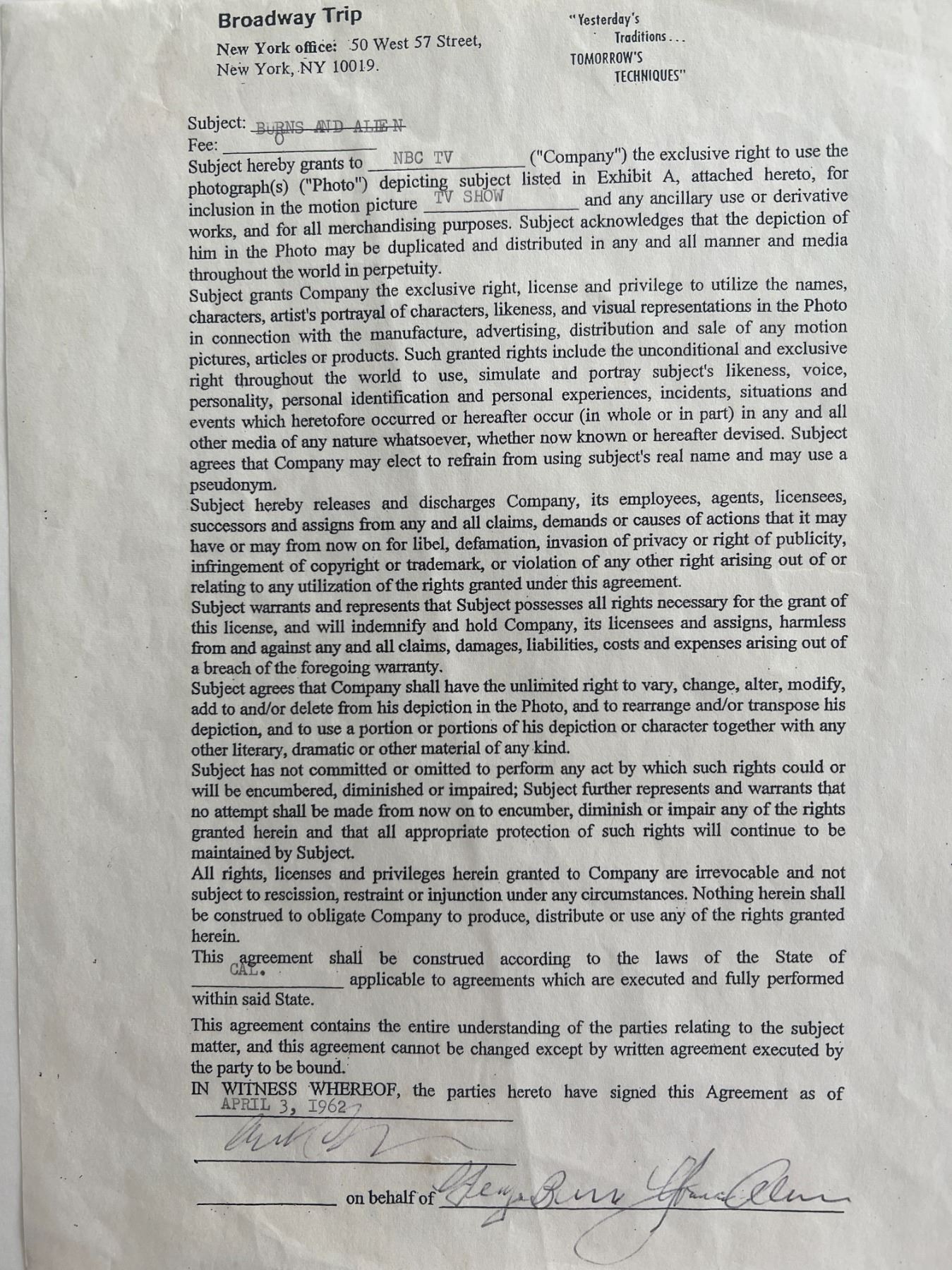 George Burns and Gracie Allen 1962 Broadway Trip signed contract. 8x11 inches