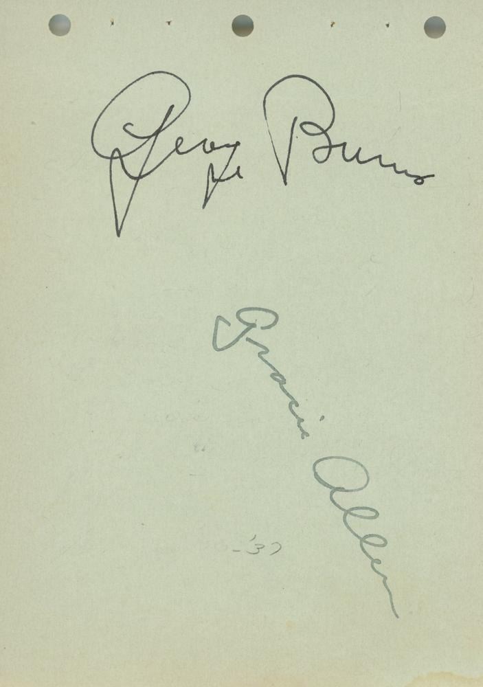 George Burns and Gracie Allen original signatures on an autograph page. GFA Authenticated