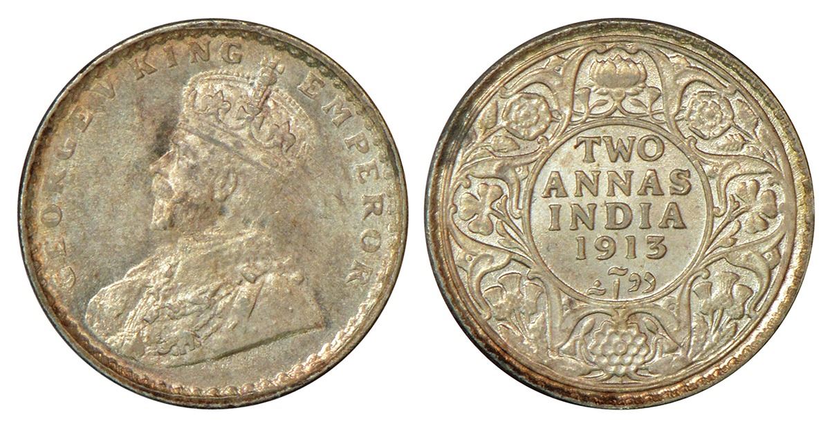 George V, silver 2 annas, 1913, Bombay mint, dot, PR 572, GK 1111, 1.47g.