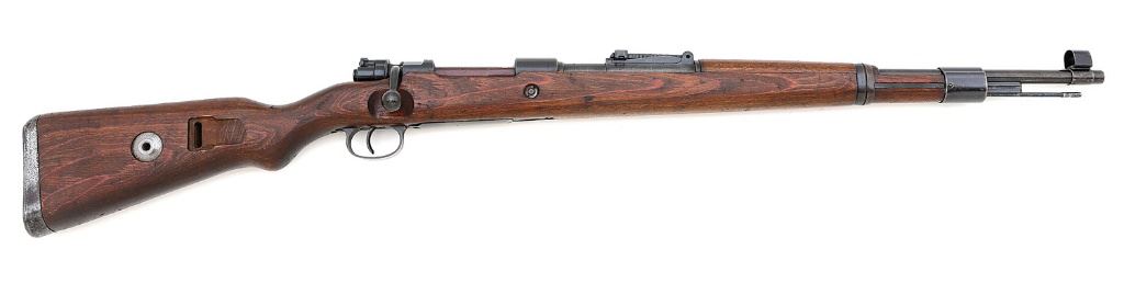 serial #4532p, 8mm Mauser, 24” barrel with an about excellent bore exhibiting strong rifling throughout. The action surfaces of this 1942-dated rifle retain about 95% arsenal blue with scattered handling wear and areas of light oxidation. The barrel retains a mostly gunmetal gray patina with some arsenal blue showing through, the front and rear barrel bands show perhaps 50% black finish. The bolt is numbered “2999ae” and exhibits light operational wear with the extractor toned to plum, with the magazine and lower triggerguard mostly gray displaying an even thin arsenal blue with hints of oxidation and handling marks. The manufacturer markings remain intact and strong with some of the stampings exhibiting proper “(eagle) / WaA140” Waffenamts, a crisp “bcd” Gustloff Werke marking, an “FN16/45 1941” barrel shank marking, and the buttplate “brg” subcontractor-marked. The laminated hardwood stock and handguard remain in about very good plus condition with a few mild abrasions and light dings from the years. The stock is stamp-numbered matching the action underneath both the upper handguard and forend, the toeline is marked “c” above faint Waffenamt and there appears to be no other visible proof marks. All screws are present, all parts are appropriately marked with 140 waffenamt and the rifle includes a correct, period cleaning rod. This rifle would make a fine addition to anyone’s German martial collection. (28A11591-76) {C&R} (700/900)