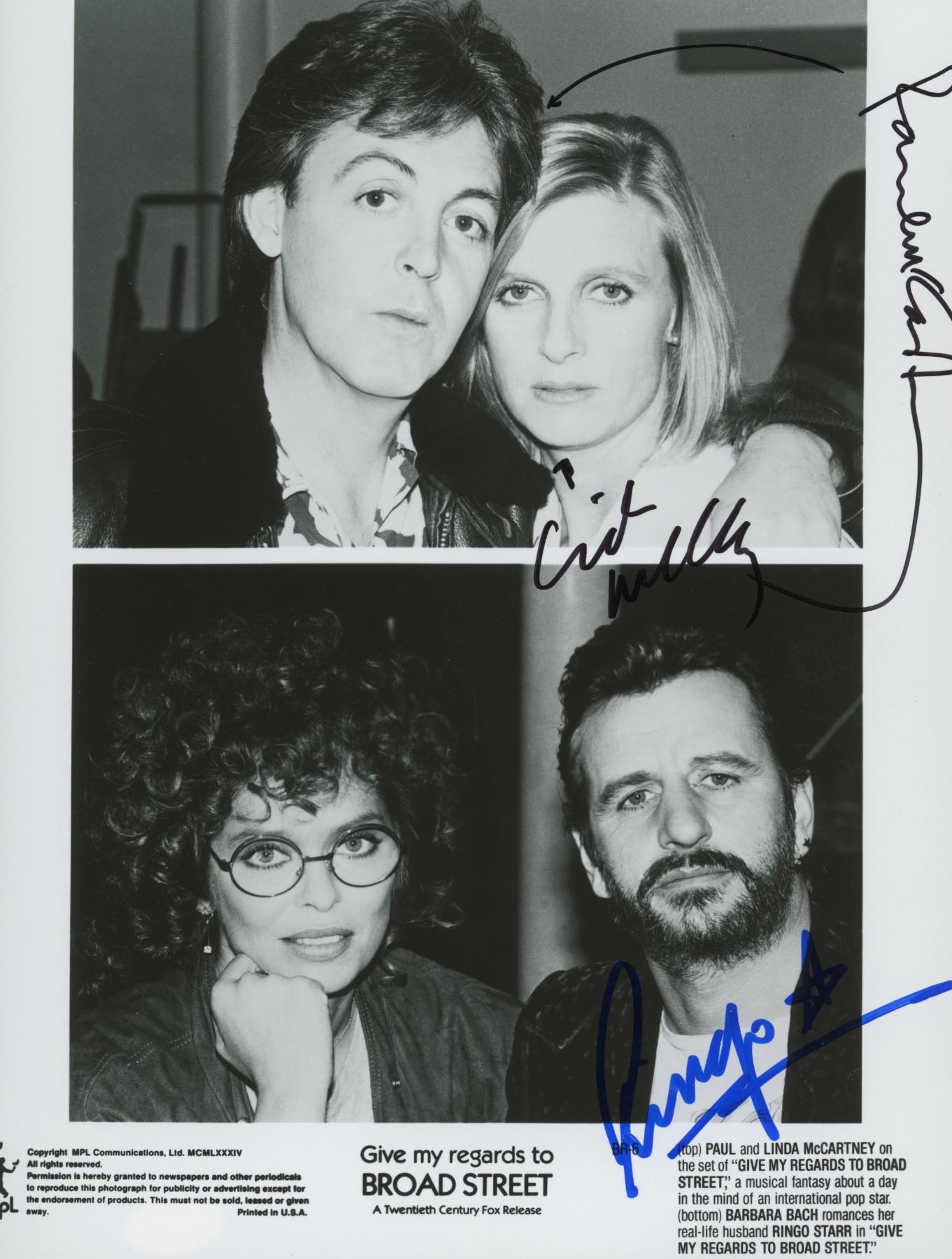 Give My Regards To Broad Street promotional photo autographed by Paul McCartney, Linda McCartney, Ringo Starr. Custom framed, matted 11x14 inches.