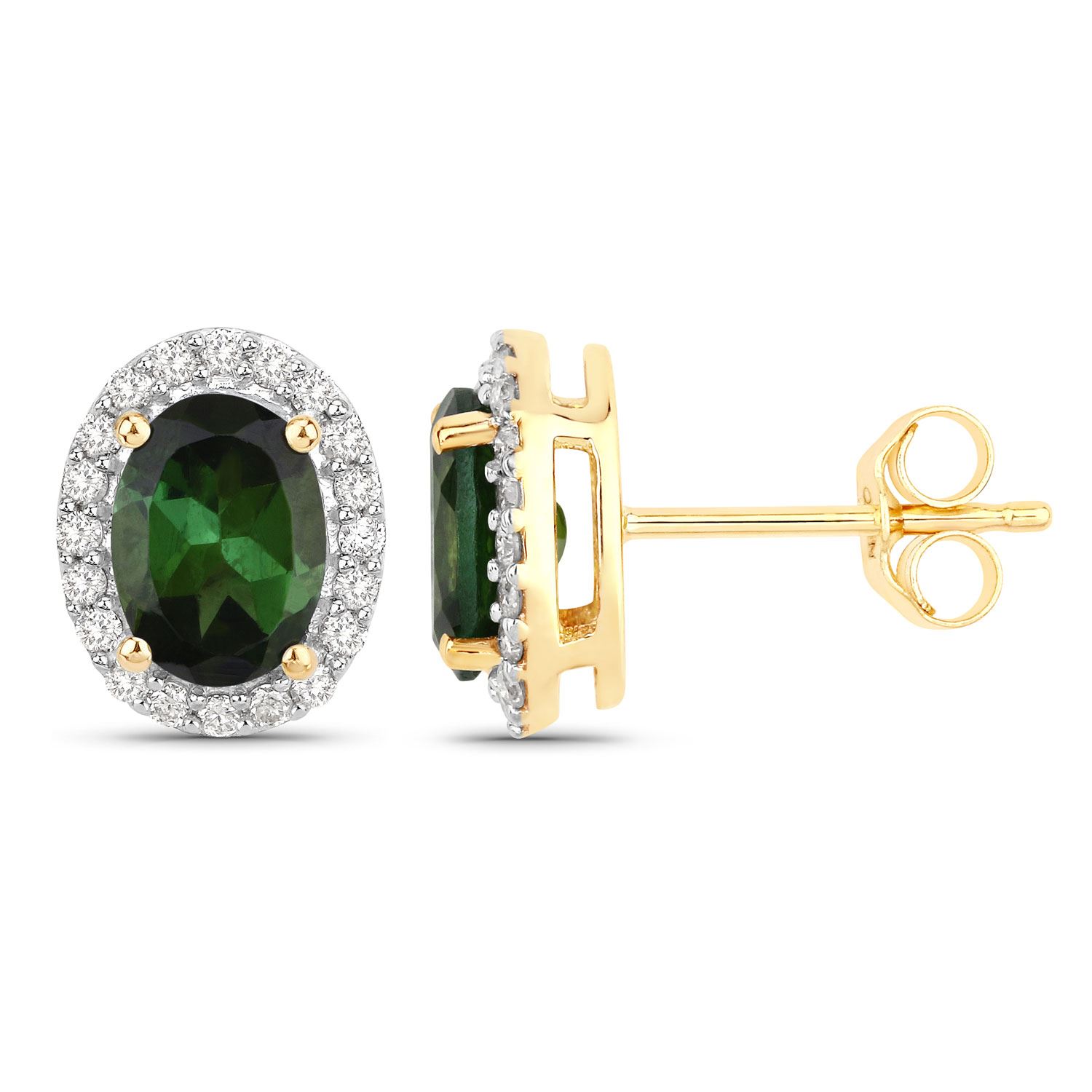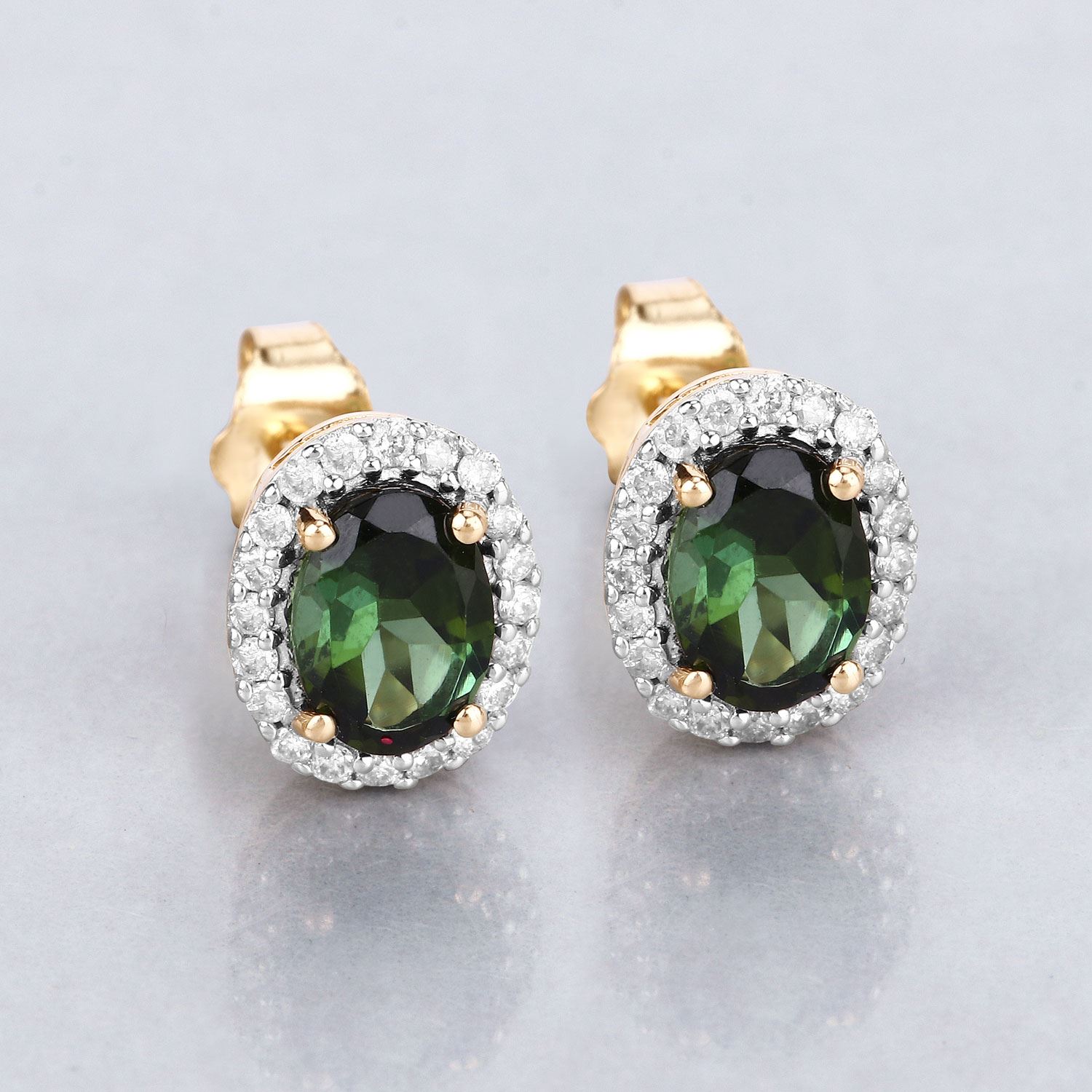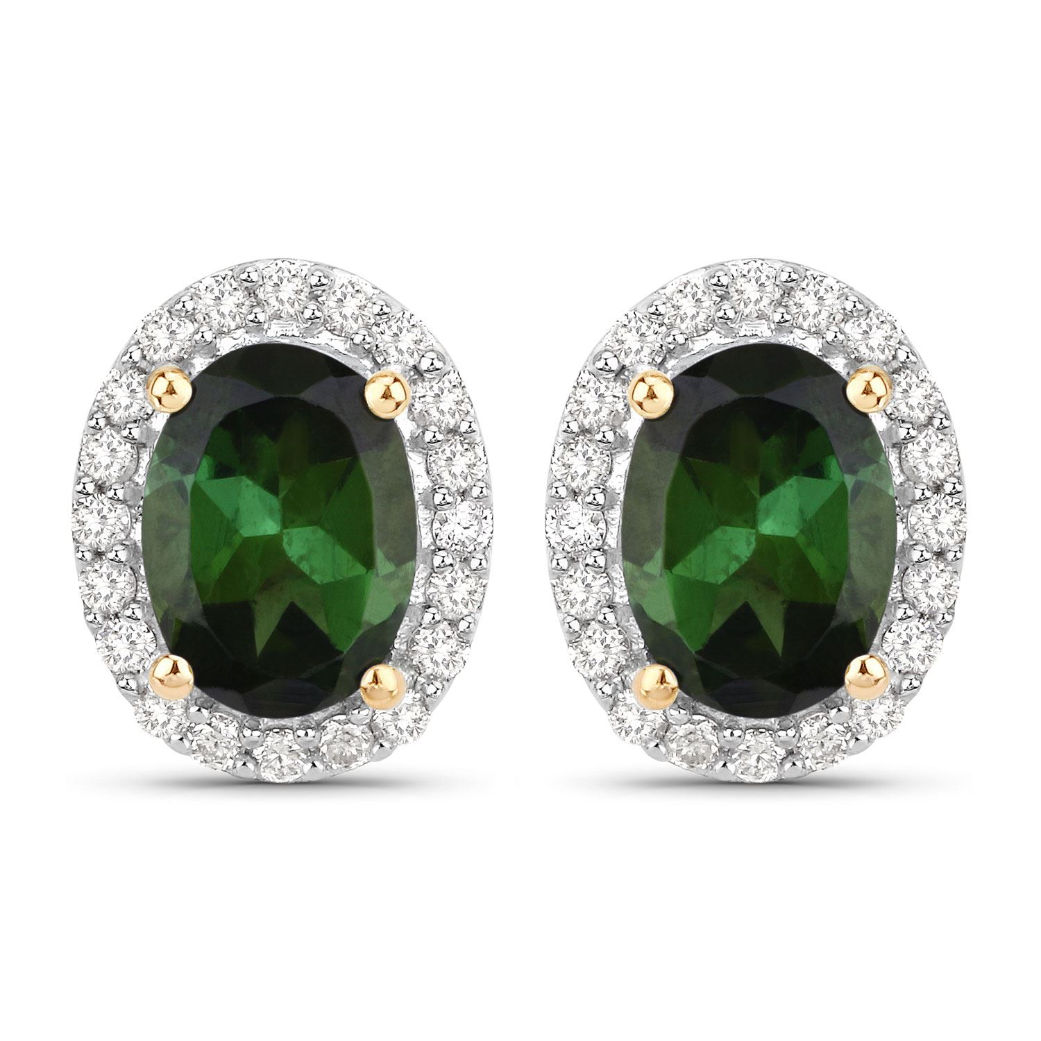 This is a pair of14 karat yellow gold earrings that features 1.66 carats total weight of oval-cut, prong-set, genuine forest green verdelite, also called green tourmaline.& nbsp; There is .26 carats of round, brilliant-cut, H-I color, I1 clarity, Earth-mined, natural diamonds in the halos.& nbsp;& nbsp;
