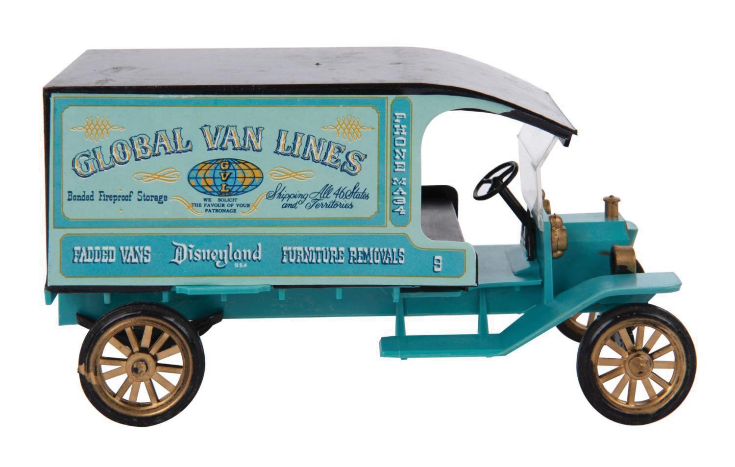 (Disneyland, c.1960s) A vintage toy replica of the Global Van Lines antique moving van. Constructed of plastic with printed color labels, a transparent plastic windscreen, and rolling plastic wheels, this miniaturized version of the iconic Main Street mainstay includes the original cardboard box packaging. The van measures 6.75"x3.5" and 3" deep and is in good condition with some minor paint rubbing to the grill, surface wear to the roof, and minor lifting to the labels from age. The box is in good condition, exhibiting some creasing, a small tear on the bottom of the rear side, and minor separation at the edges.