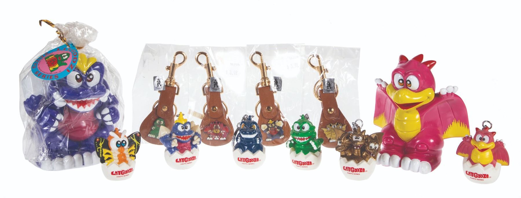 1994. Concorde Corp. LitGodzi Kaizyu Series Lot of 2 Plastic Banks/5 Plastic Egg Keychains/4 Vinyl & Enamel Keychains. Banks: 5” Egg Keychains: 2. 25” Enamel Keychains: 4. 5”. VG+.
