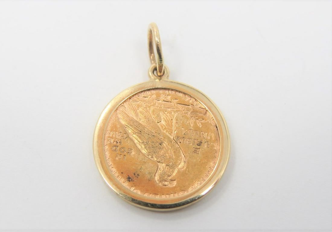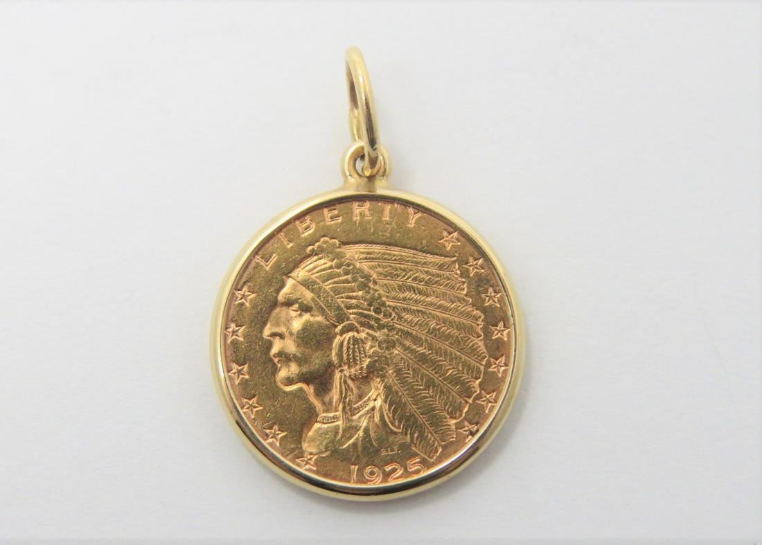 Gold Indian Head half dollar coin set in 14K yellow gold bezel. 19 mm circumference.