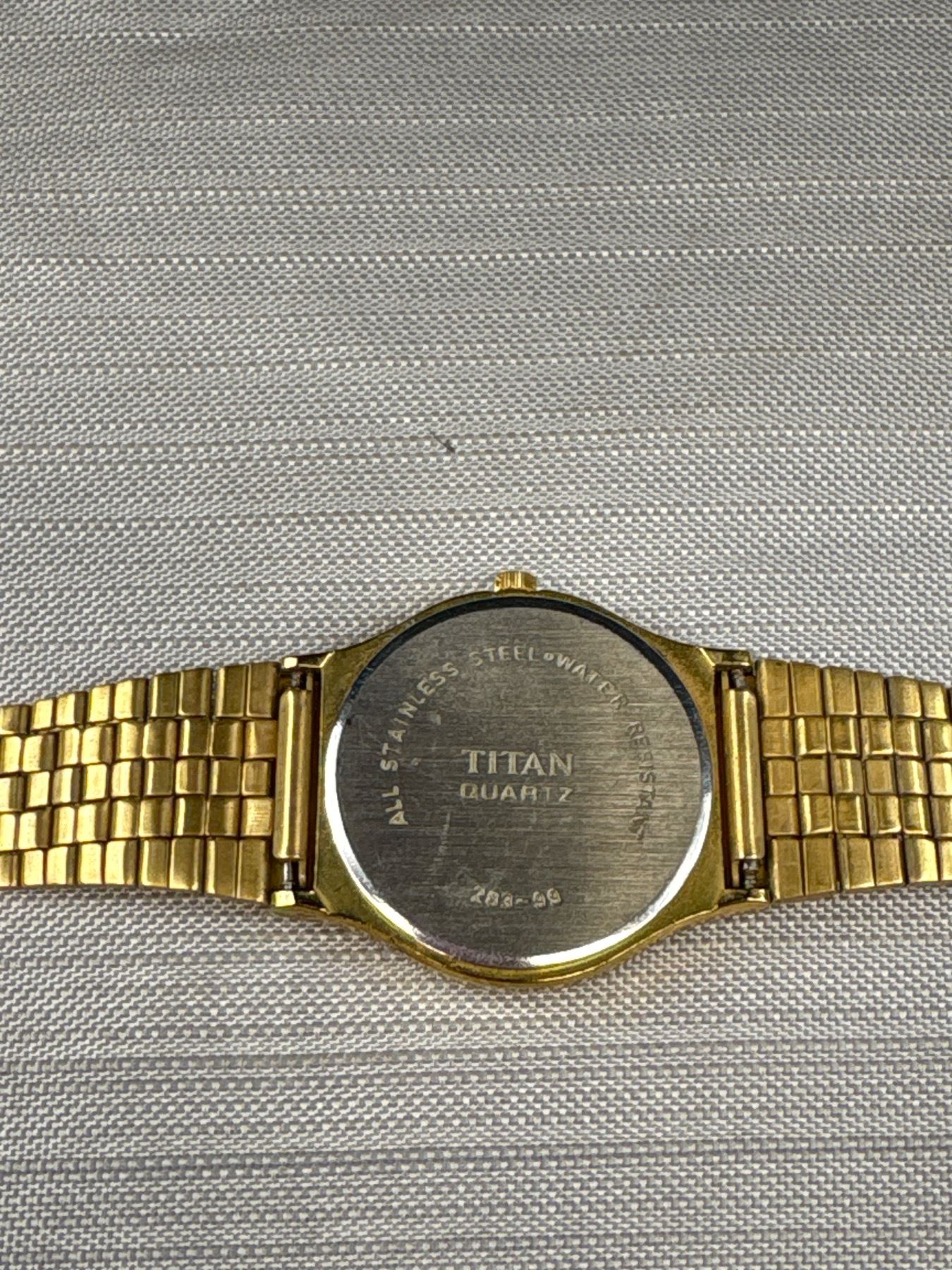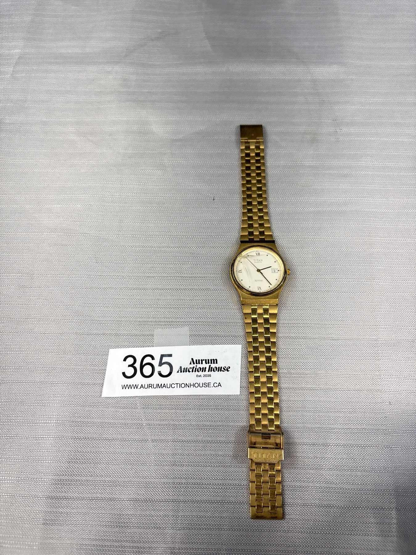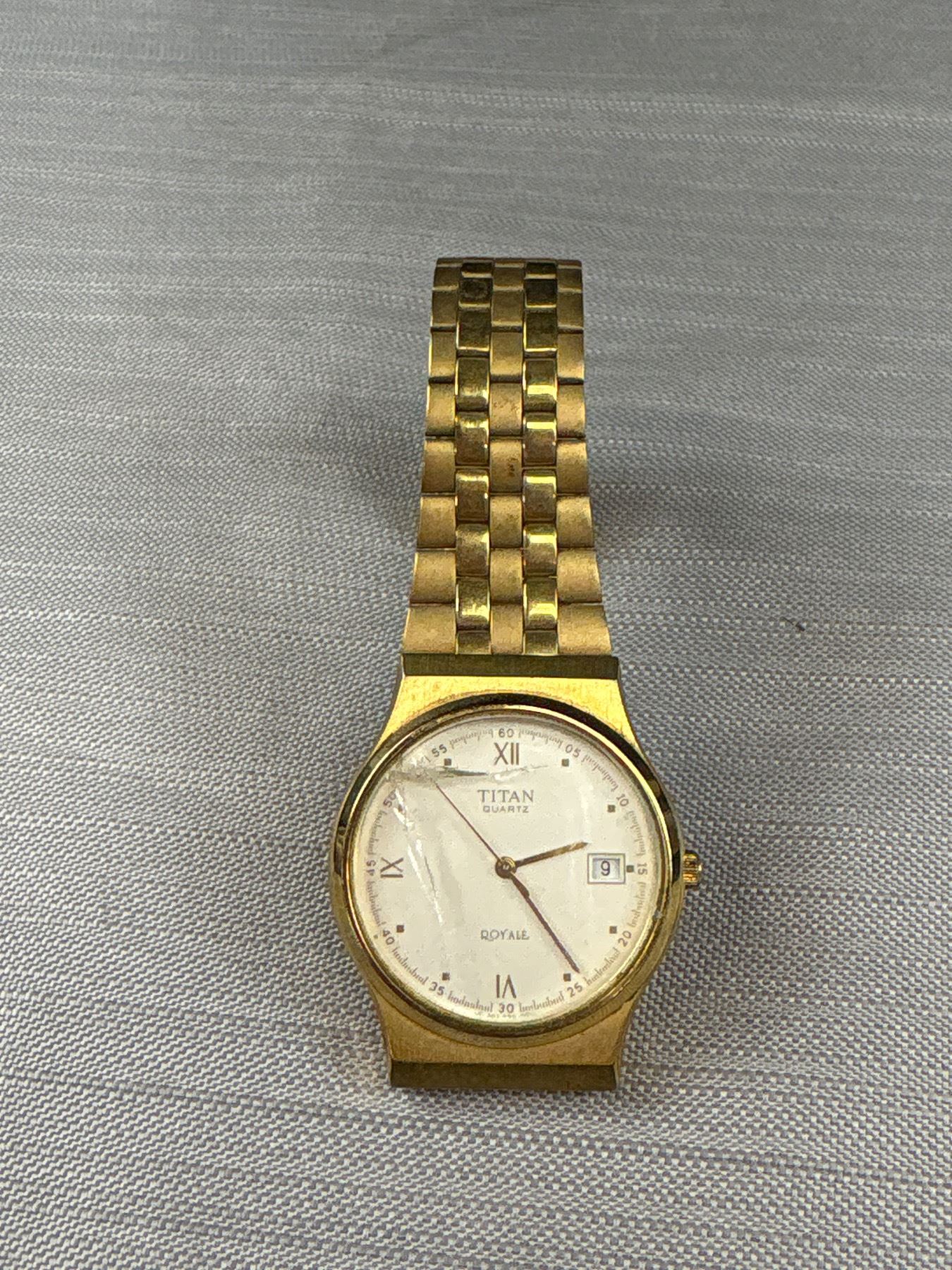 Gold Plated Stainless Steel Titan Quartz Watch w/ Date Battery Required, Glass Cracked, Otherwise in Good Condition