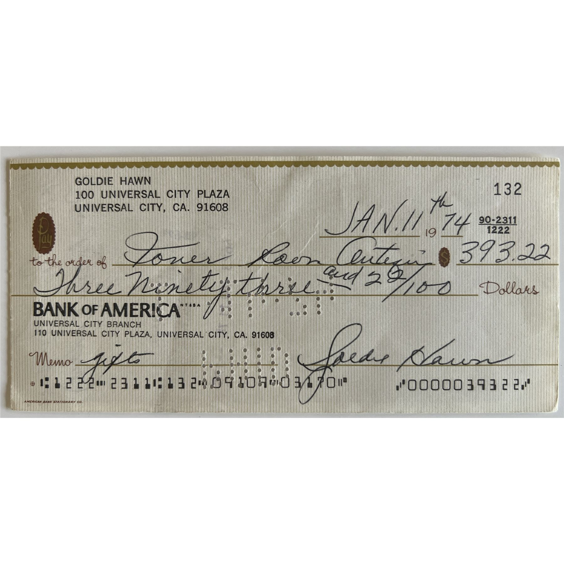 Goldie Hawn signed check. GFA authenticated. 2x6 inches