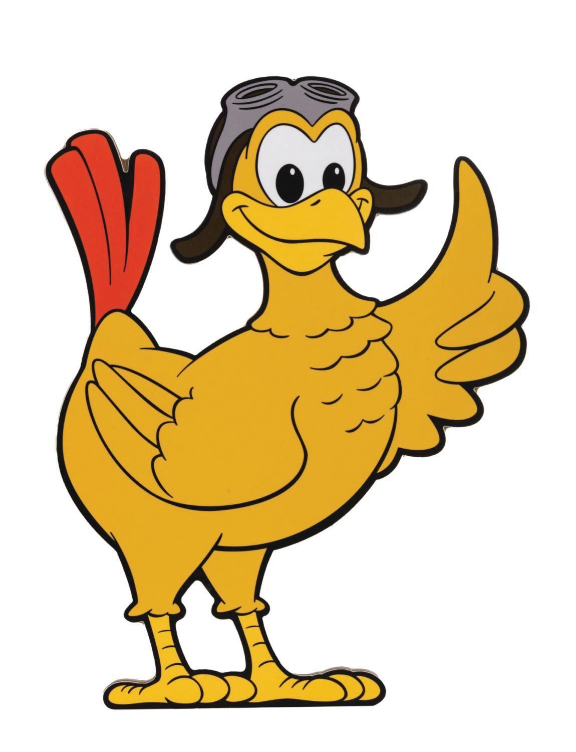 (California Adventure, 2011) A Chicken prop prototype sample used in the theming for Goofy's Sky School at Disney's California Adventure Park. The red-tailed chicken wearing an aviator helmet and goggles assists student pilots in learning to "fly the Goofy way." The thumbs up chicken appears at the base of the FastPass ticket dispensers at the top of the FastPass distribution facade for the attraction. Measuring 17"x13.25" the cut-out composite wooden sign is in very fine condition.