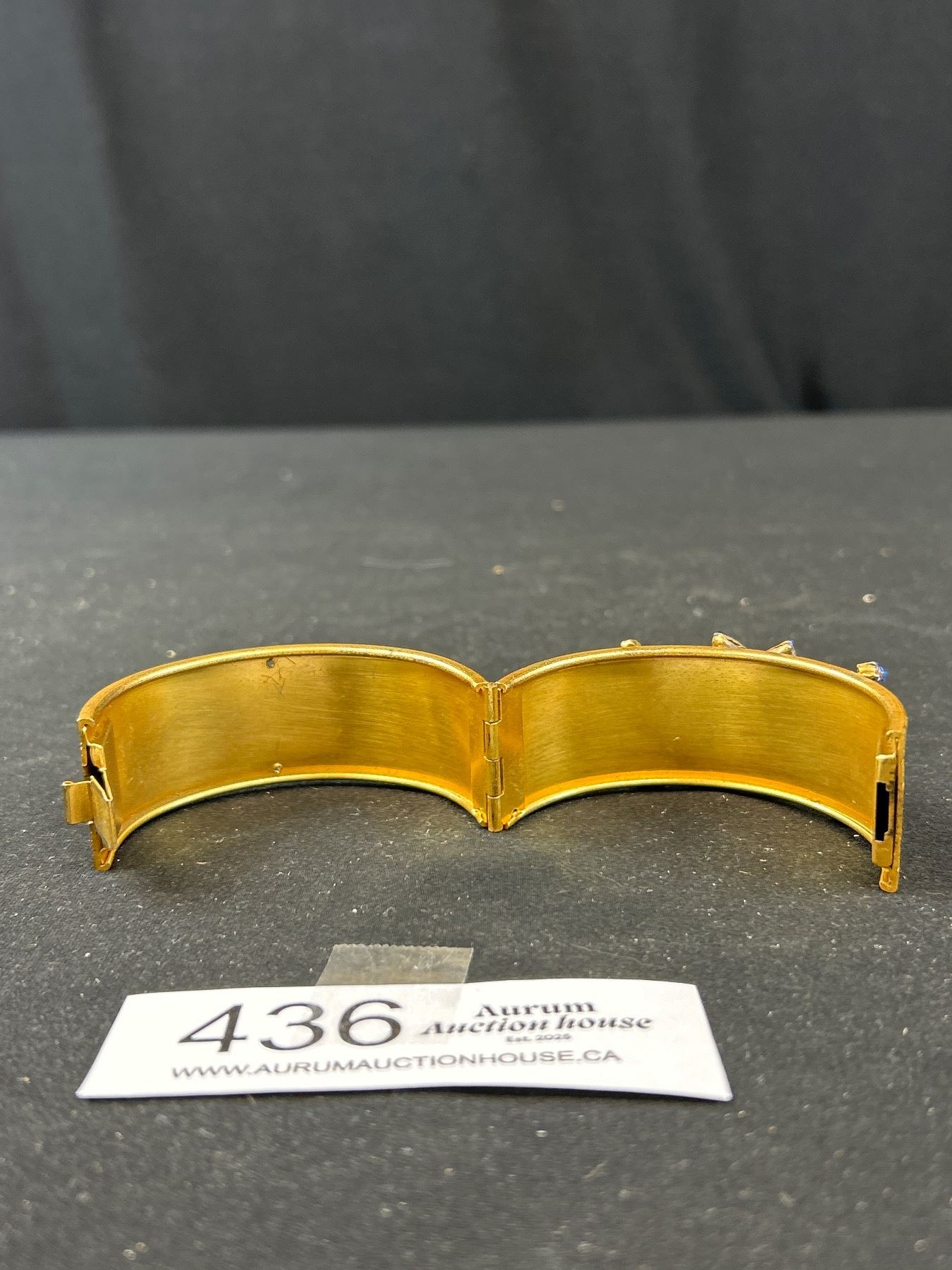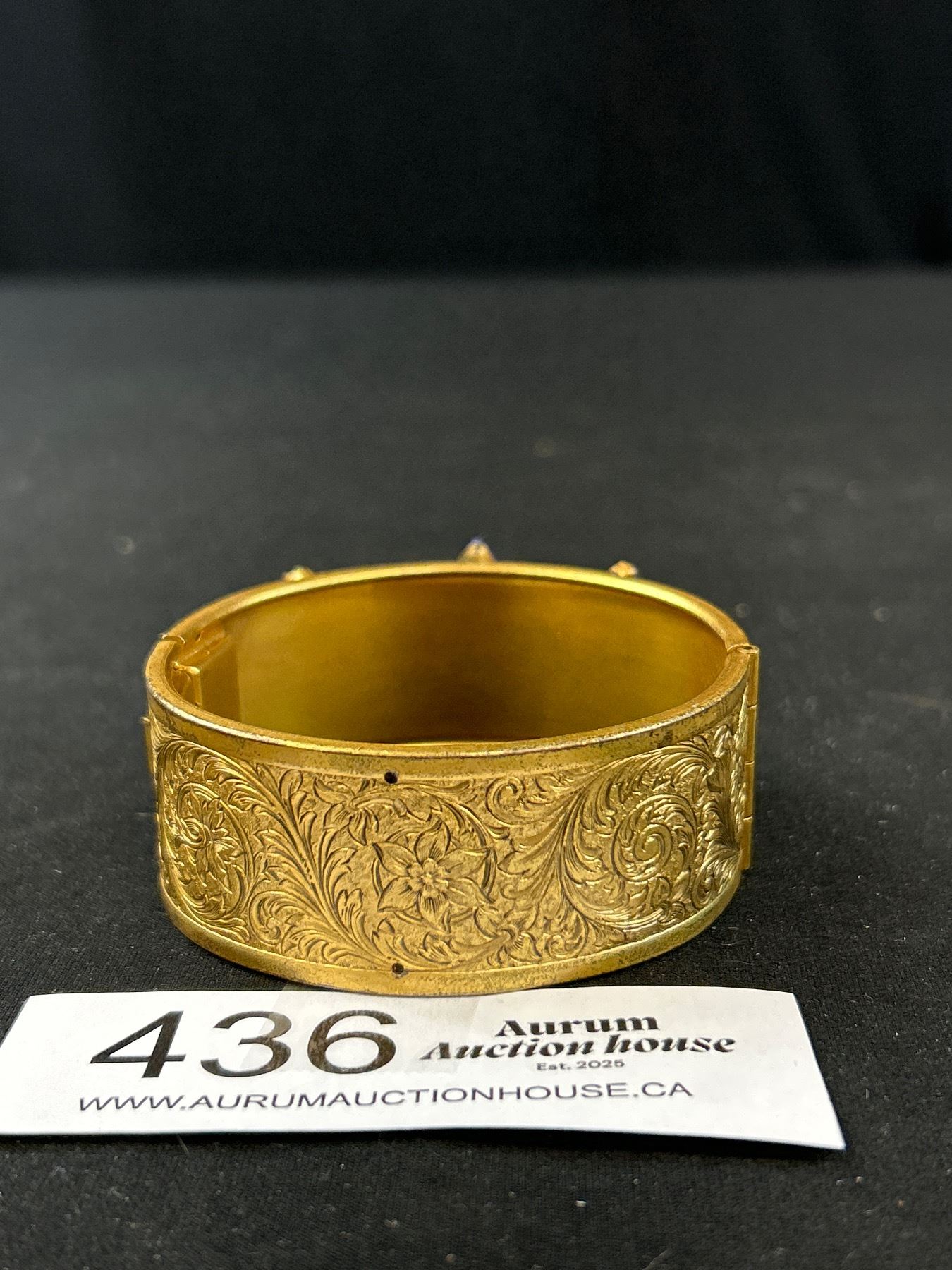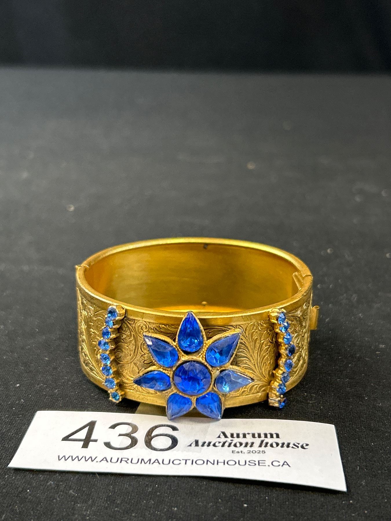 Gorg3ous Vintage Hinged Bangle Engraved Design Blue Rhinestones