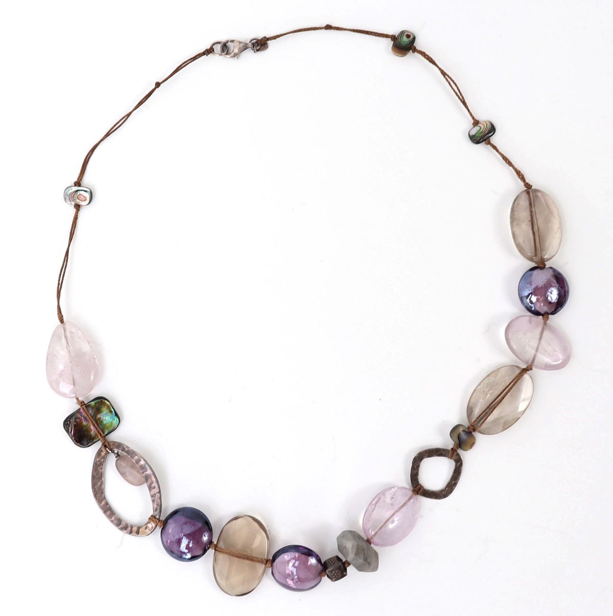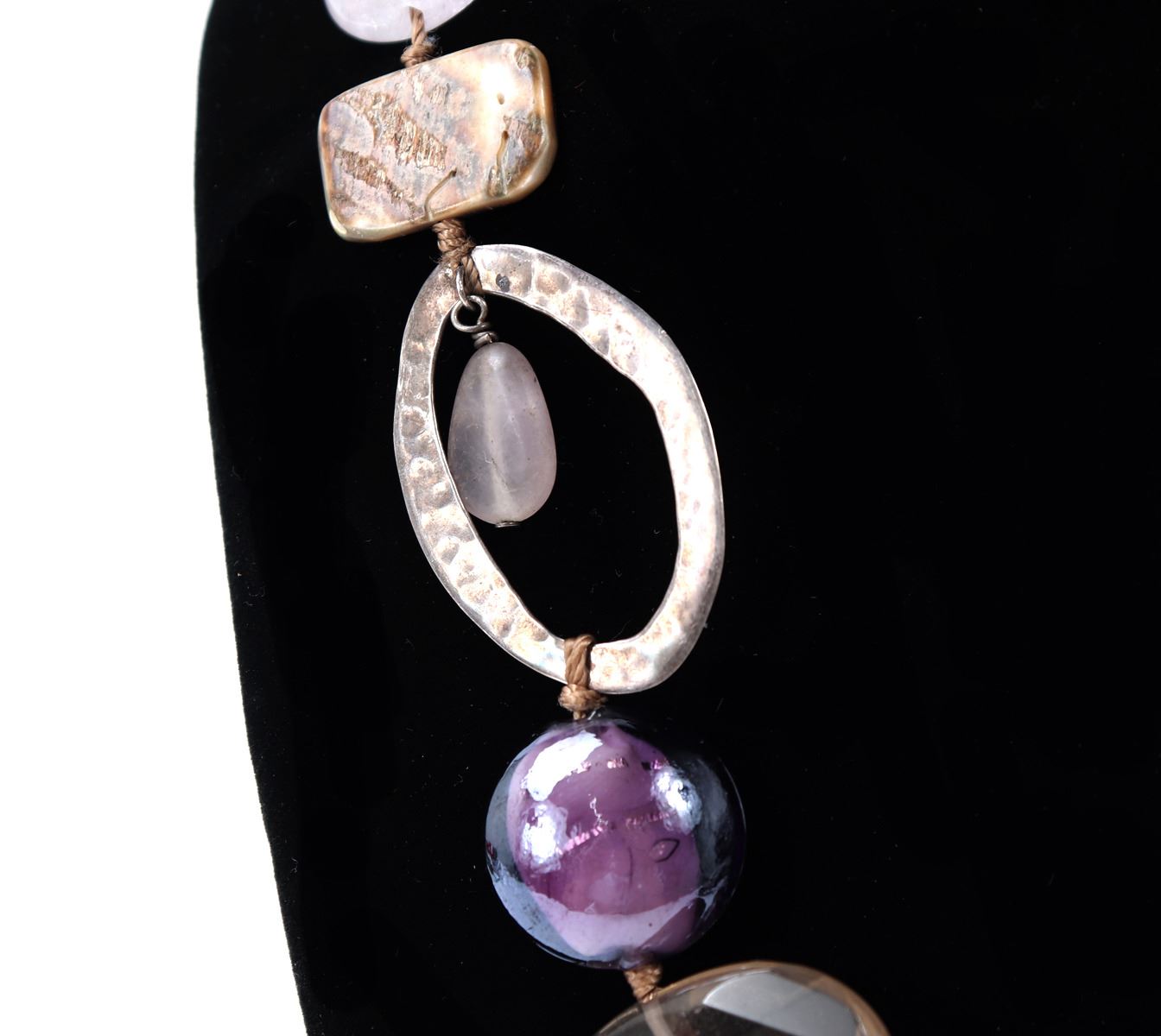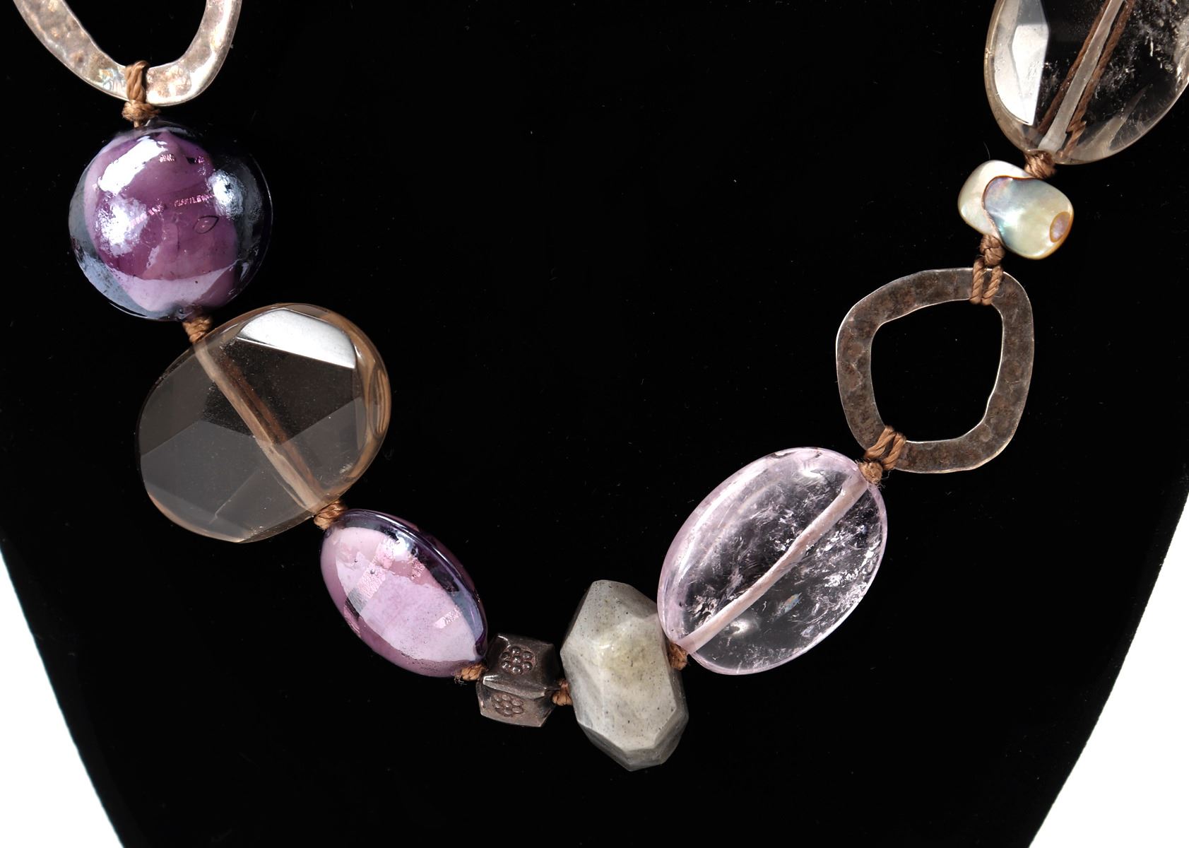 Beautiful unique amethyst and rock crystal mineral specimen necklace with big bold beads throughout. Hammered metal frames along with shell accent beads throughout. Size 3" L, weight 66g. Condition: Wonderful wearable condition throughout.