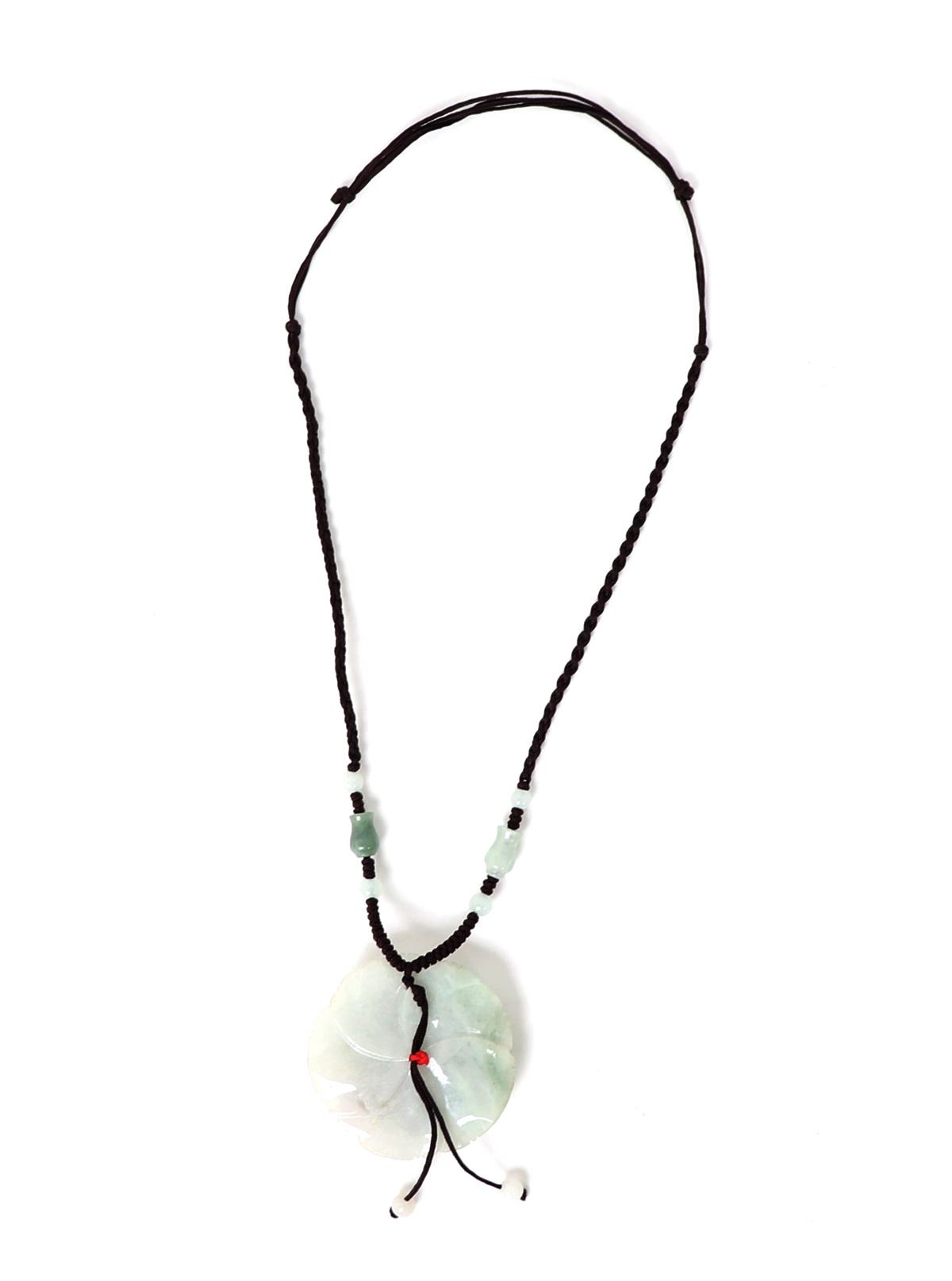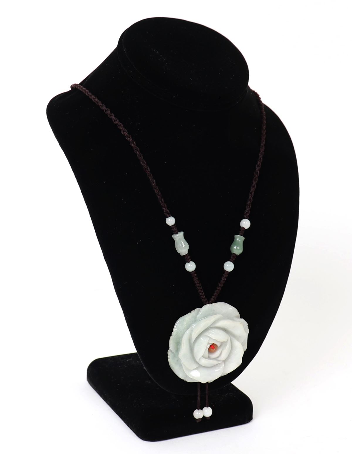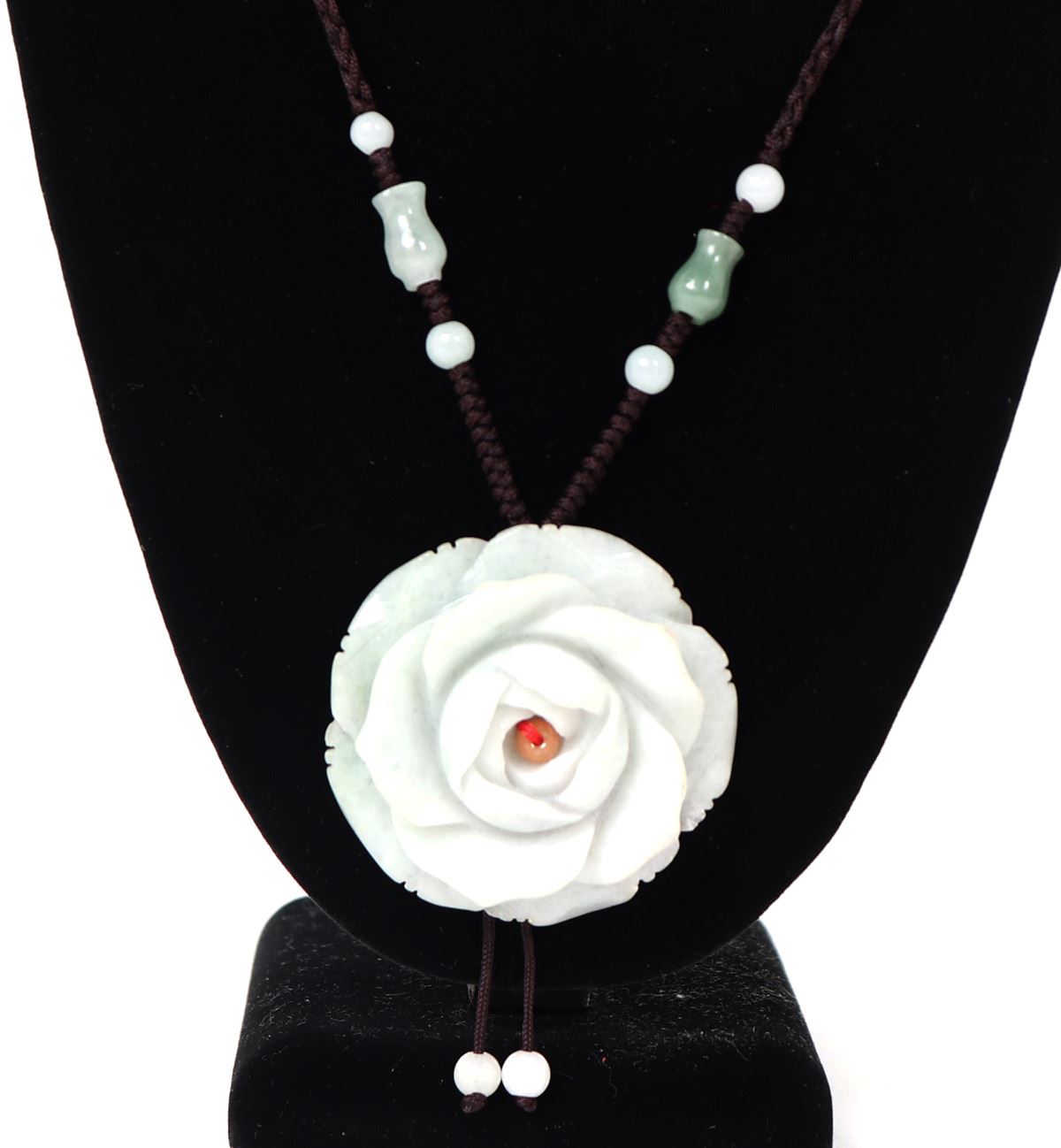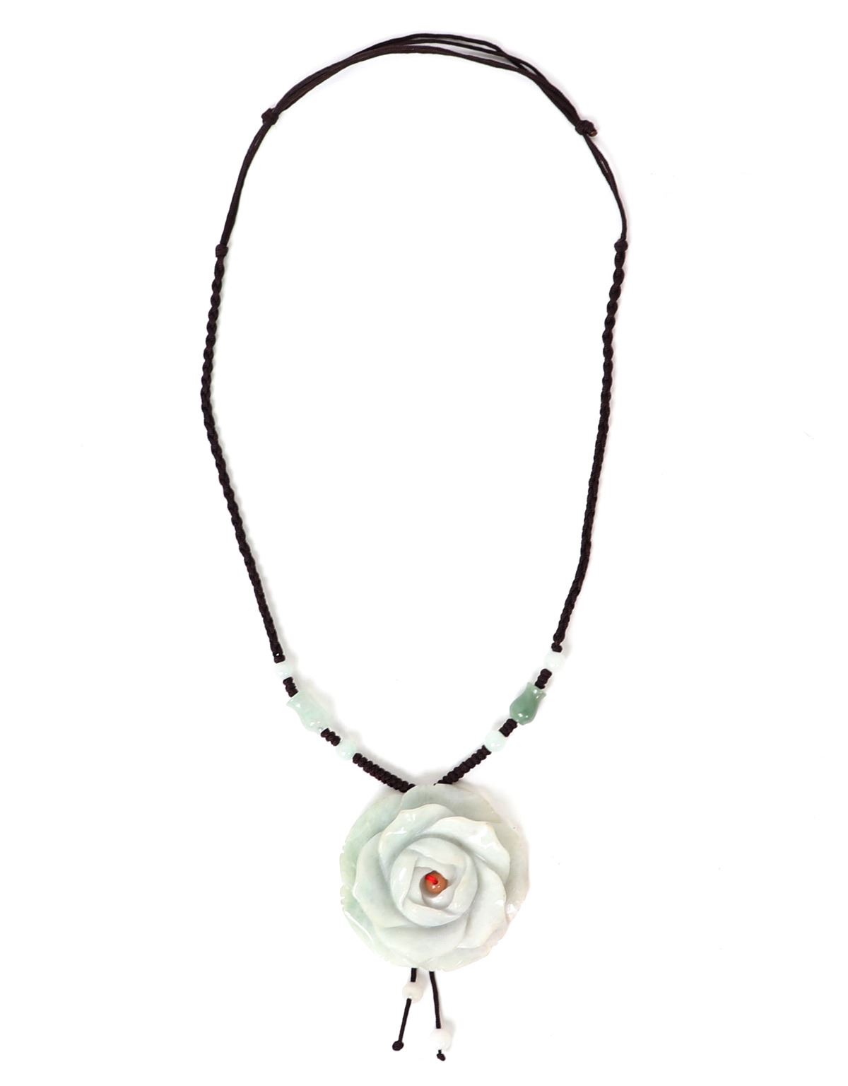 Lovely natural jadeite Chinese stone carved into a gorgeous blooming rose with a coral bead to the center. Suspended on a braided cord with hourglass jadeite accent beads. Weight 54 grams, Size 20" L. Condition: Wonderful wearable condition throughout.
