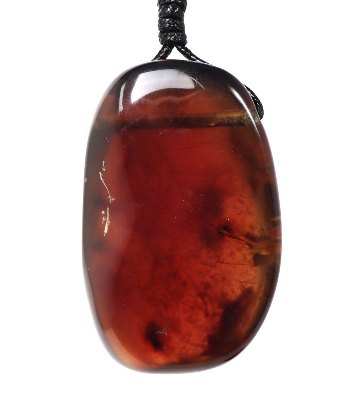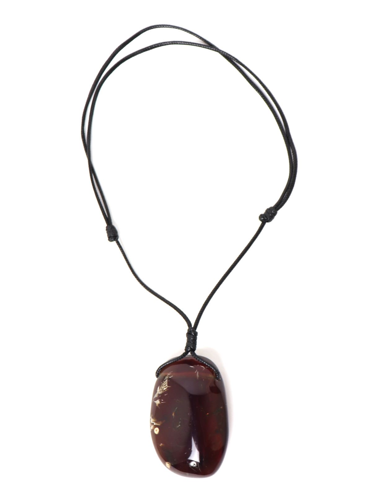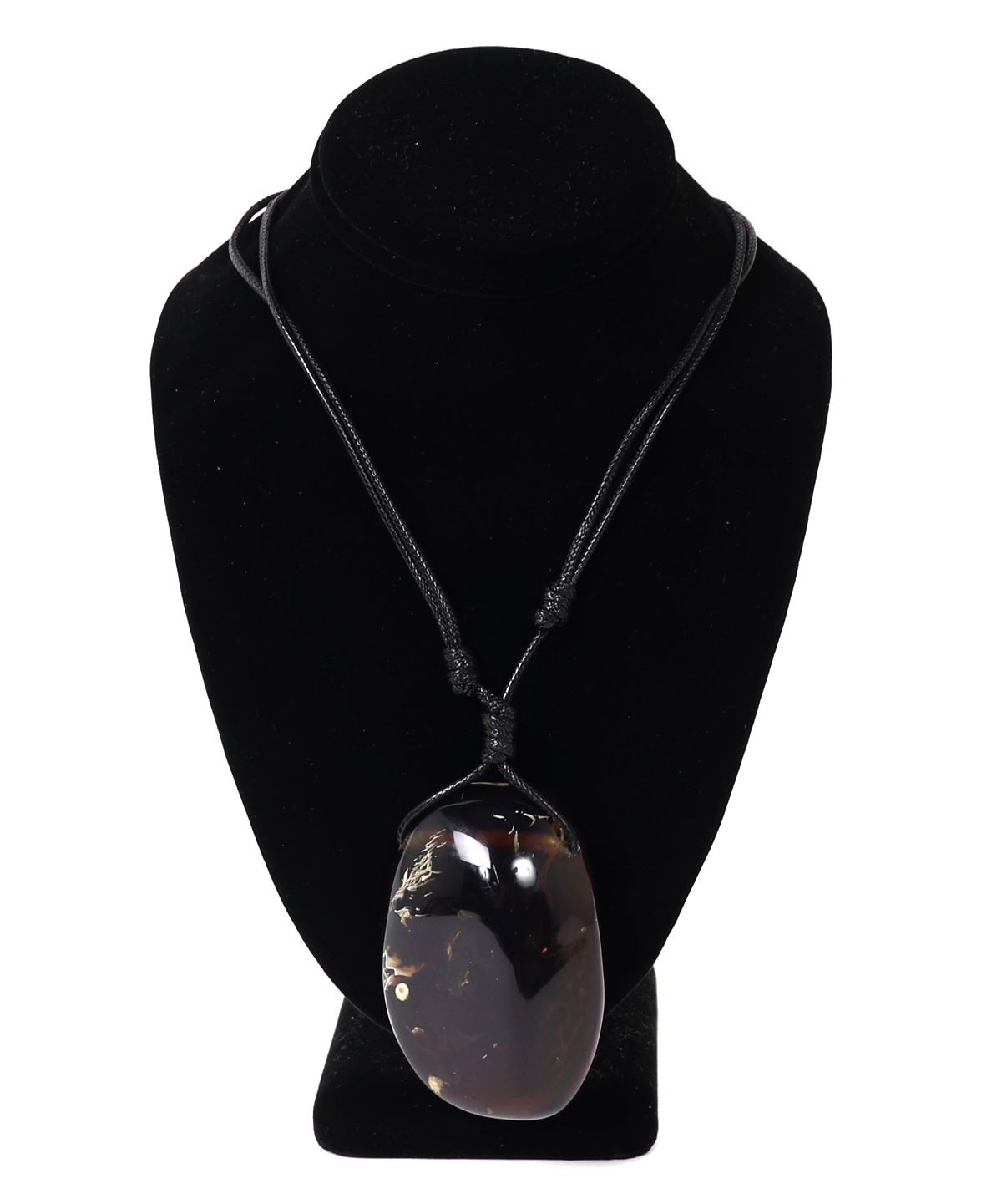 Large polished to a smooth wearable surface raw piece of pure amber with gorgeous natural veining and crystals included. Somewhat translucent in natural bright sunlight. Size 22" L, 55 grams. Condition: Wonderful wearable condition with an adjustable necklace threaded strap.