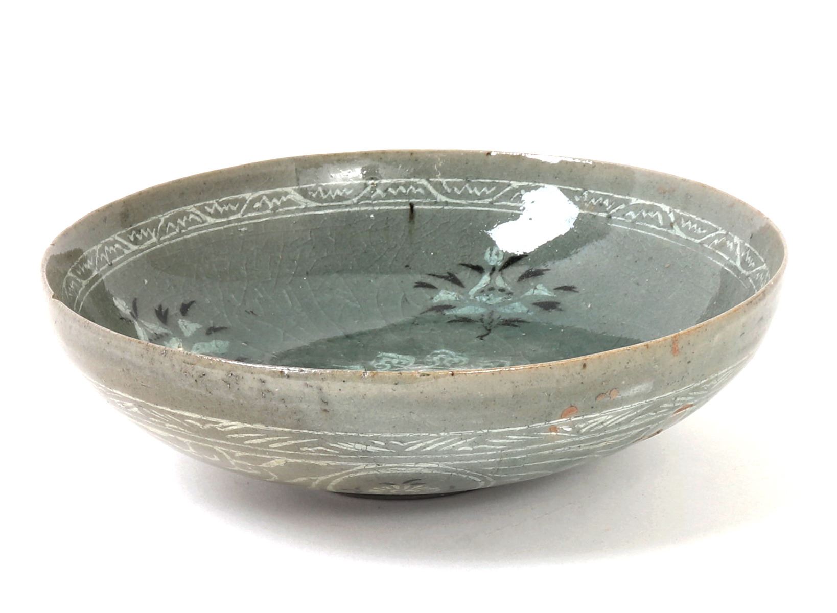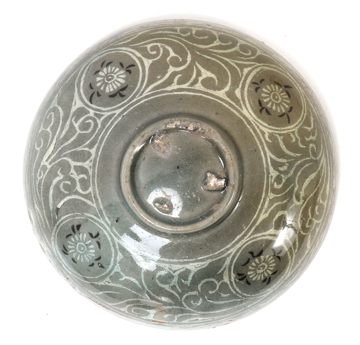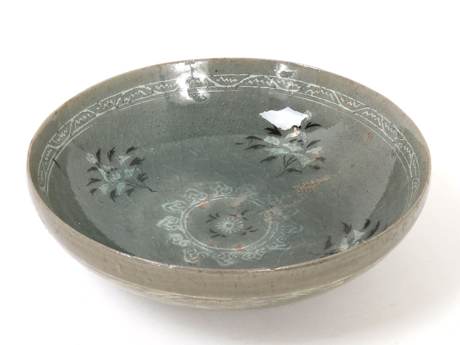 Beautiful green crackle glazed Korean bowl decorated throughout with blooming chrysanthemums and geometric and ruyi boarder to the interior. Great detail to the exterior as well with blooming chrysanthemums, leaf and wave like designs in between. Three spur marks to the base unglazed with remains of sand. Size 7" W x 2" H. Condition: Good overall condition with one small chip to the rim.