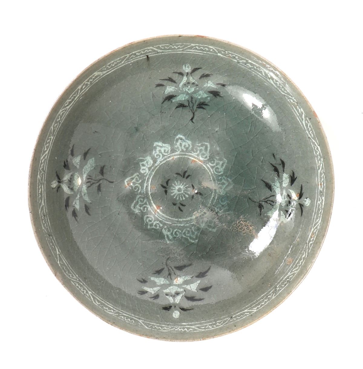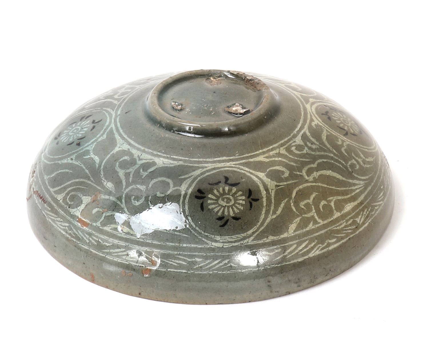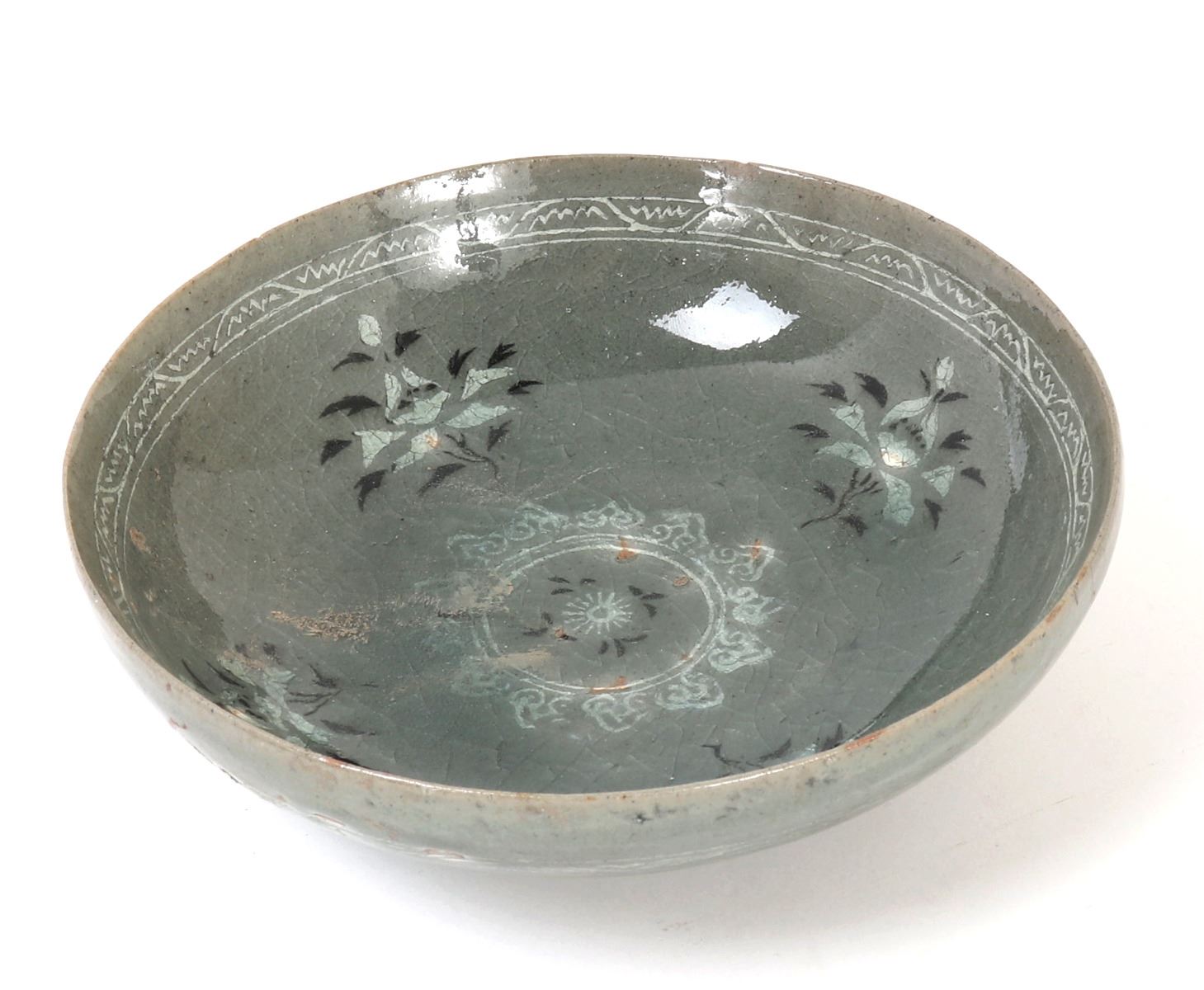 Beautiful green crackle glazed Korean bowl decorated throughout with blooming chrysanthemums and geometric and ruyi boarder to the interior. Great detail to the exterior as well with blooming chrysanthemums, leaf and wave like designs in between. Three spur marks to the base unglazed with remains of sand. Size 7" W x 2" H. Condition: Good overall condition with one small chip to the rim.