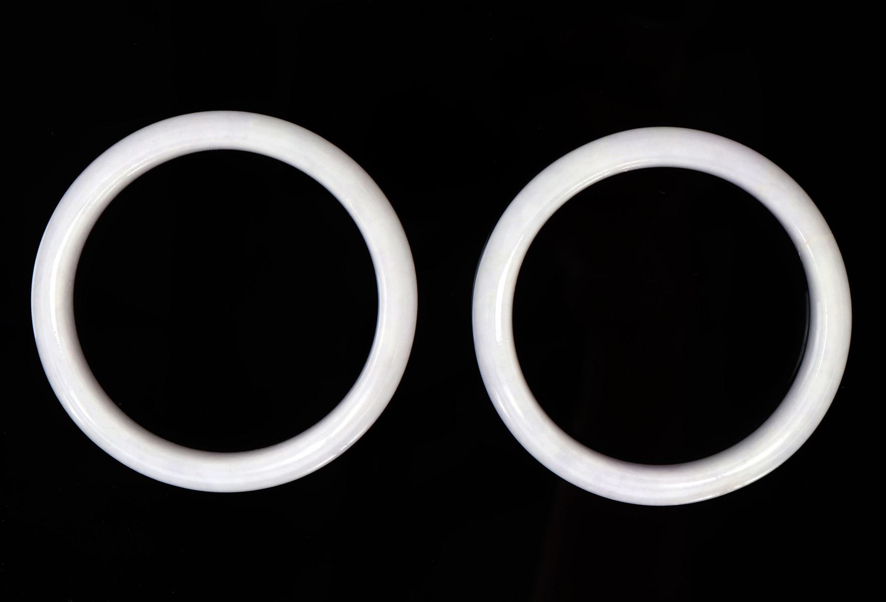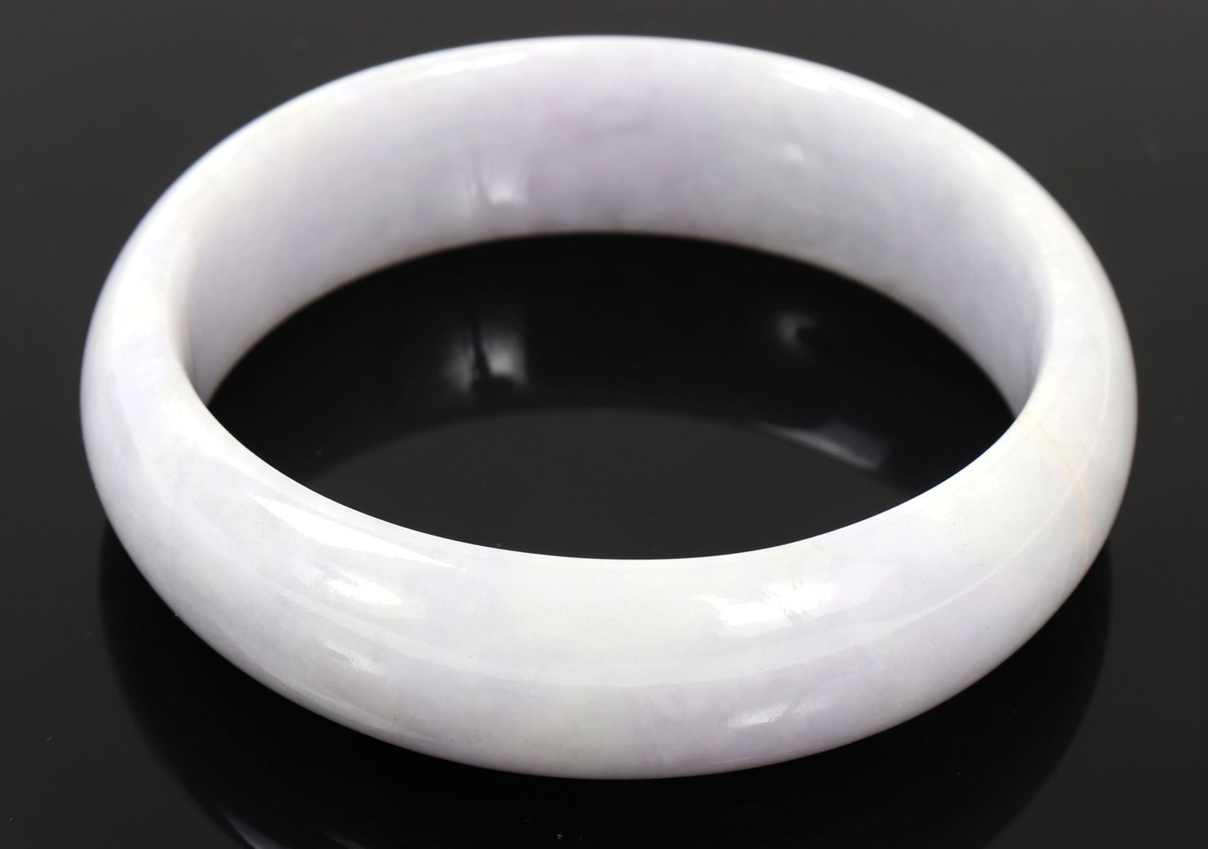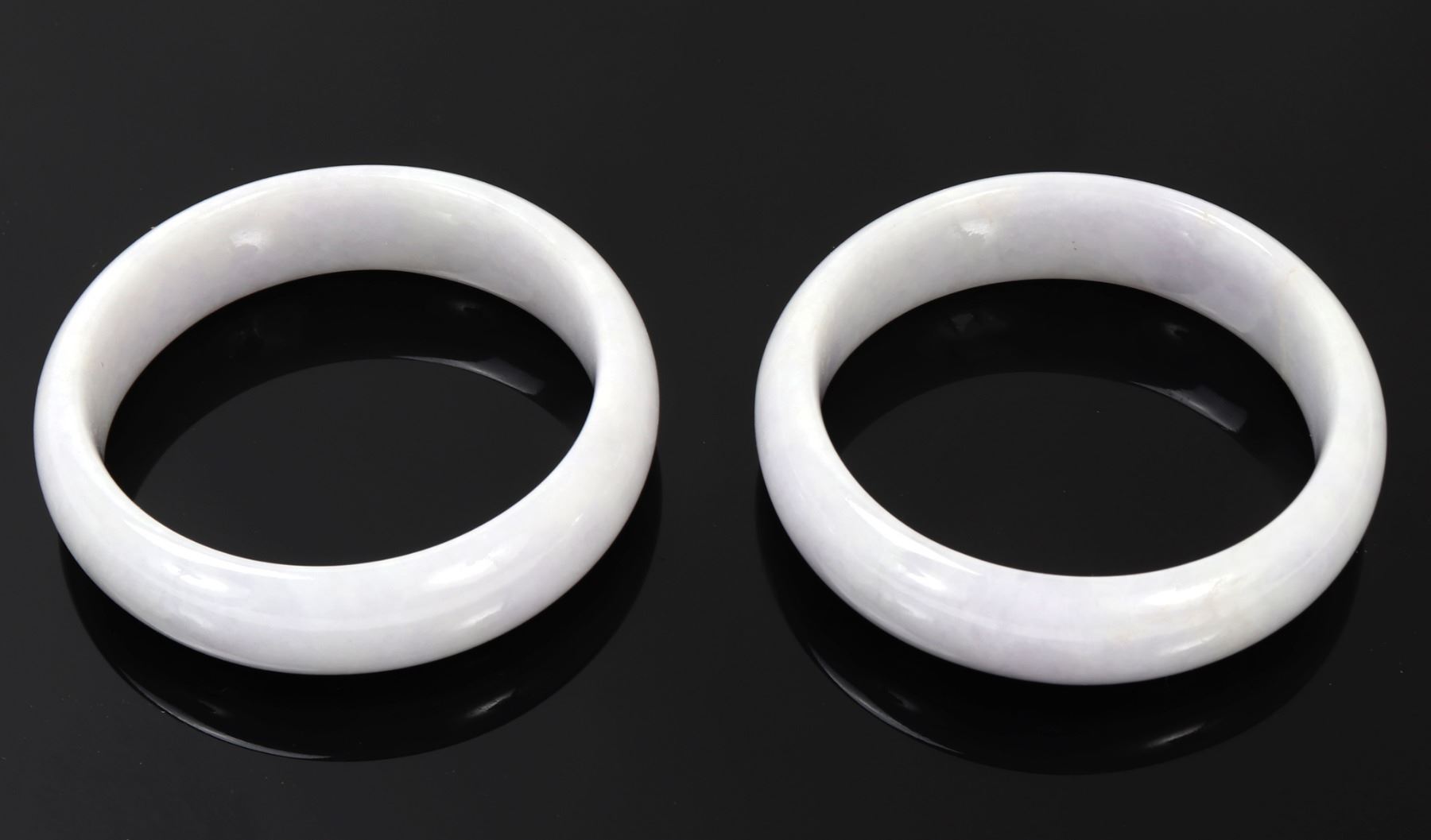 Lovely pair of Chinese lavender purple bangle bracelets with lovely snow white clouds throughout. Certified as jadeite jade for the pair and will be included. Size 2 7/8" OD, 2 1/4" ID, weight 72 g. Condition: Wonderful wearable condition throughout.