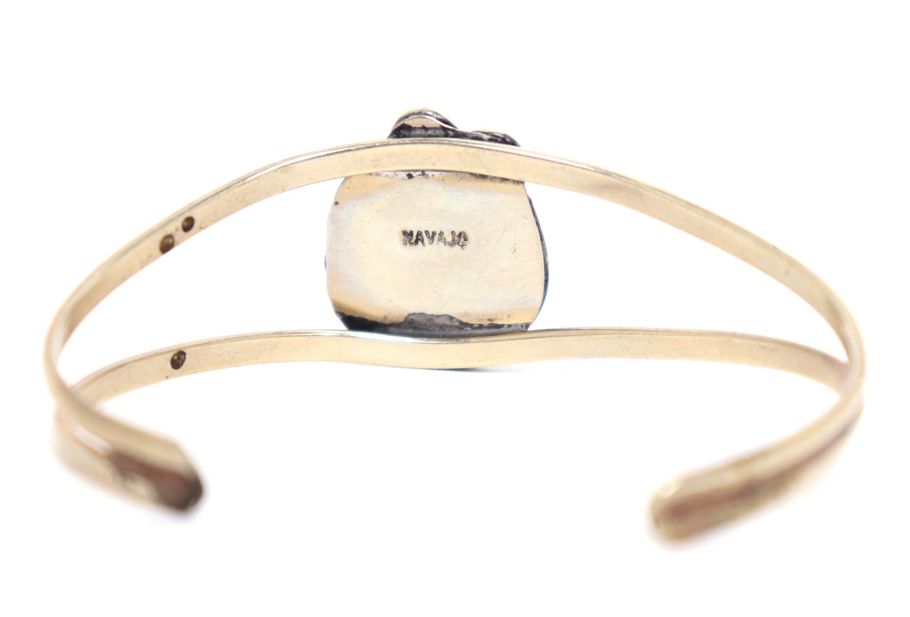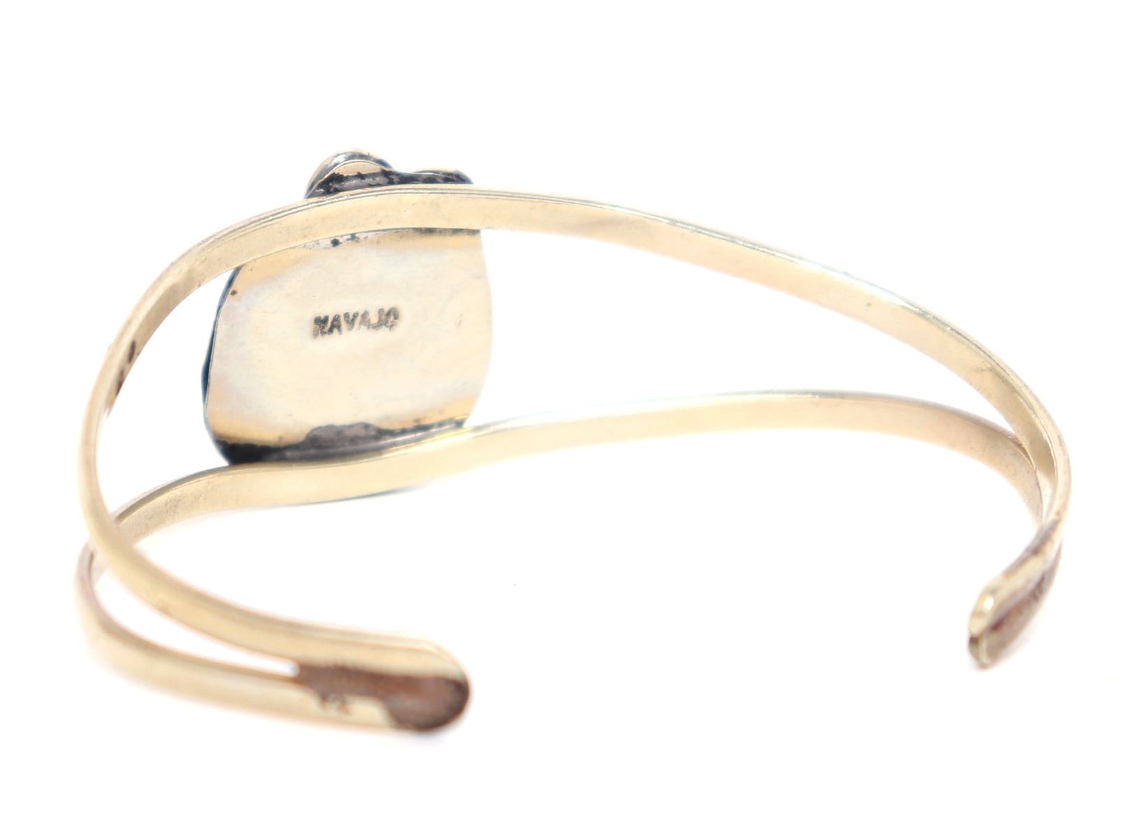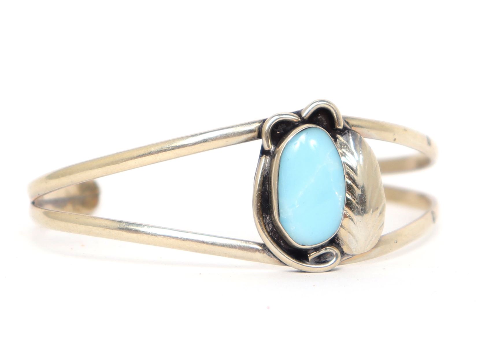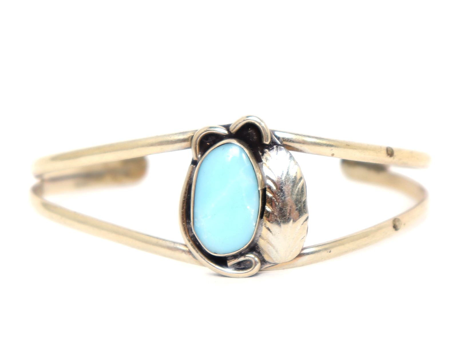 Stunning Navajo made turquoise and sterling silver bracelet. Oval turquoise polished stone to the face inset in a leaf bezel. Size 2 1/8" W end to end, 1 1/4" W opening. Condition: Wonderful wearable condition throughout.
