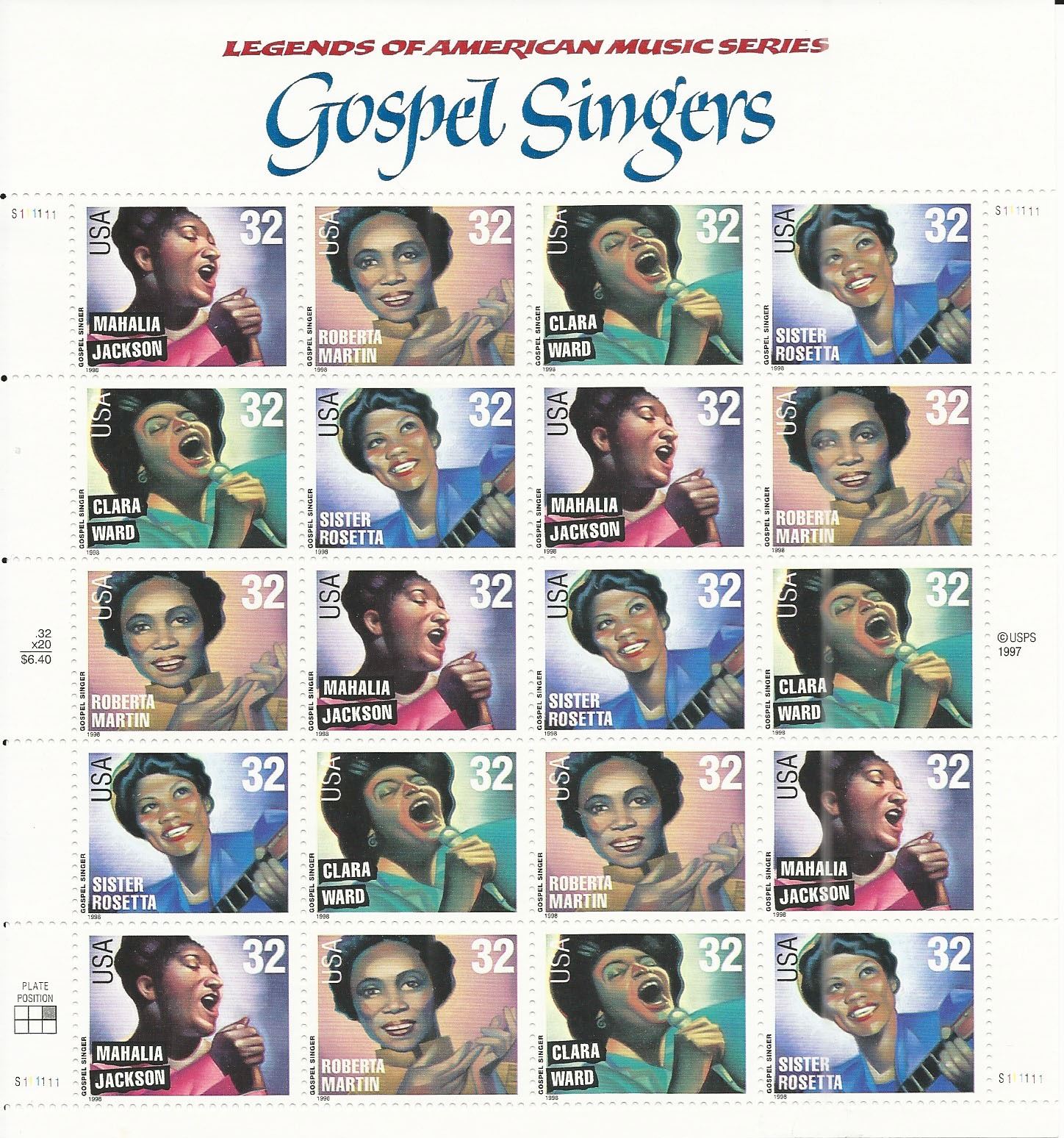 Gospel Singers Full Sheet of 20 32 Cent Stamps Scott 3216-19