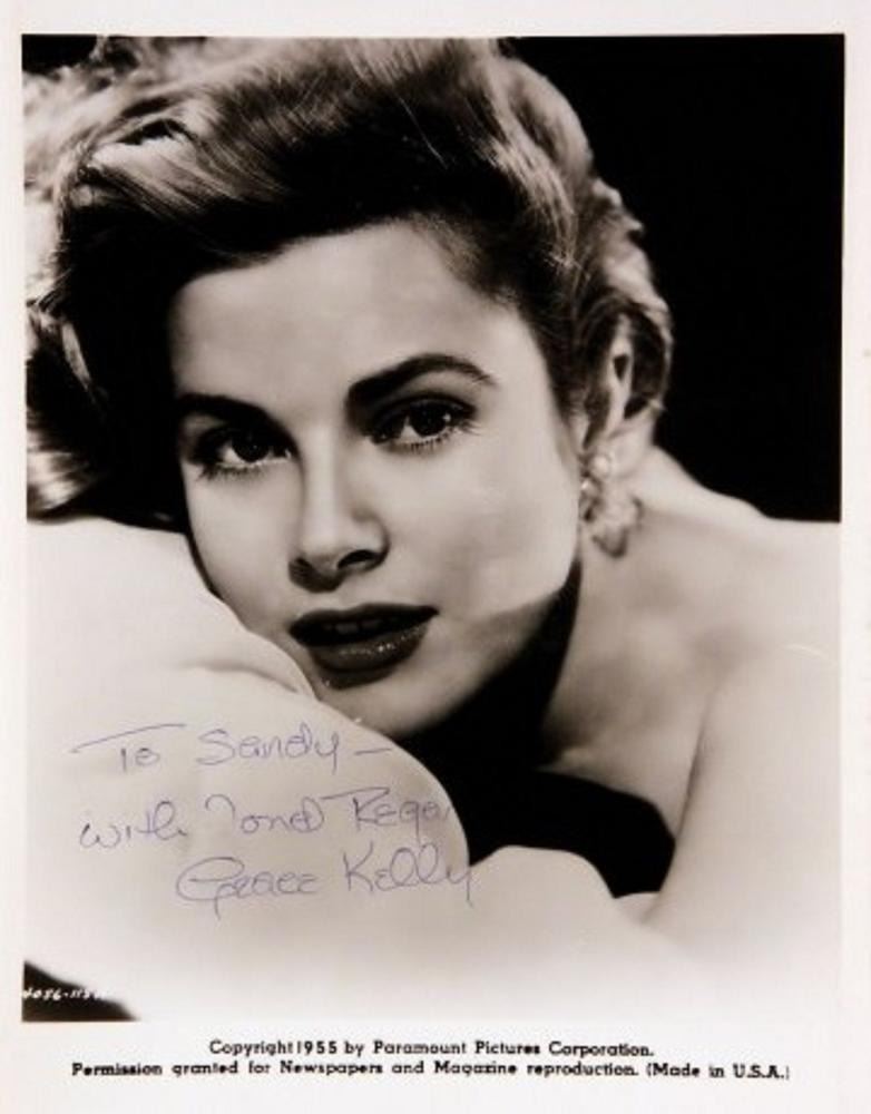 portrait photo autographed by Grace Kelly as To Sandy - With Fond Regards Grace Kelly. 8x10 inches. This item is a reprint of an original autograph