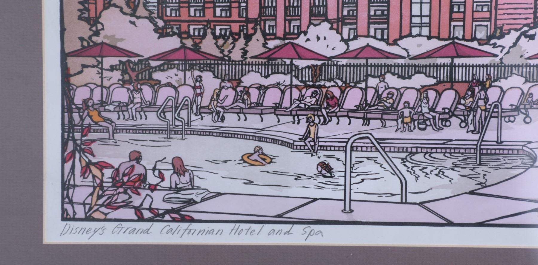 (Grand Californian Hotel c. 2000's) Rare Disney Grand Californian Hotel concept art displayed in the hotel's lobby area. Signed by the artist, the piece is in good condition with normal wear from age and hotel use. Measures approximately 45.5" x 25.5". Item comes with a Grand Circle Tour Auctions COA.