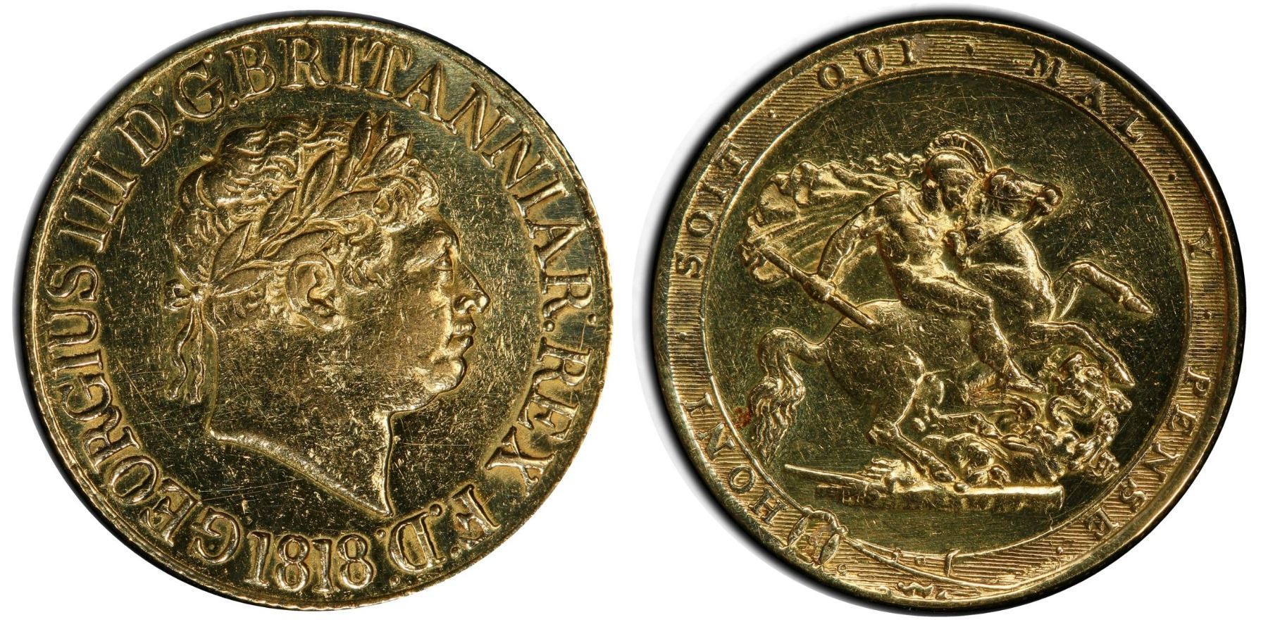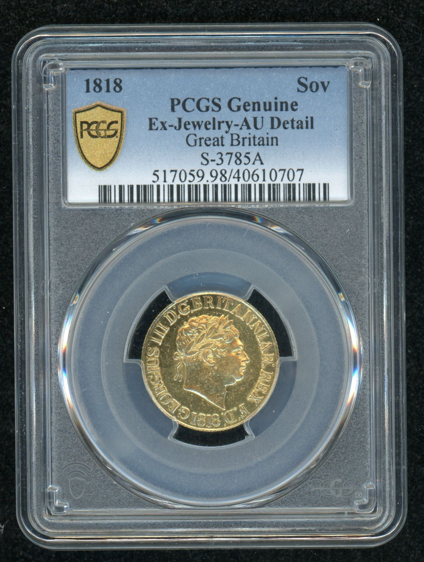 KM.674 George III, PCGS AU Detail, Ex-Jewellery with some evidence of buffing and lightly-busy fields, etc. A very scarce second-year Sovereign issue, with huge Krause value of U.S. $6,000 in EF.