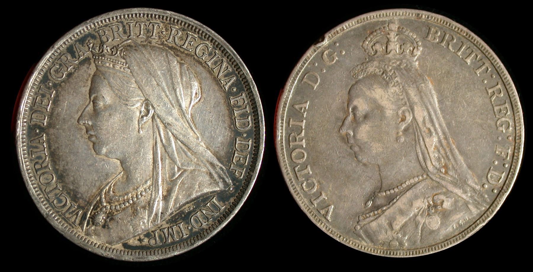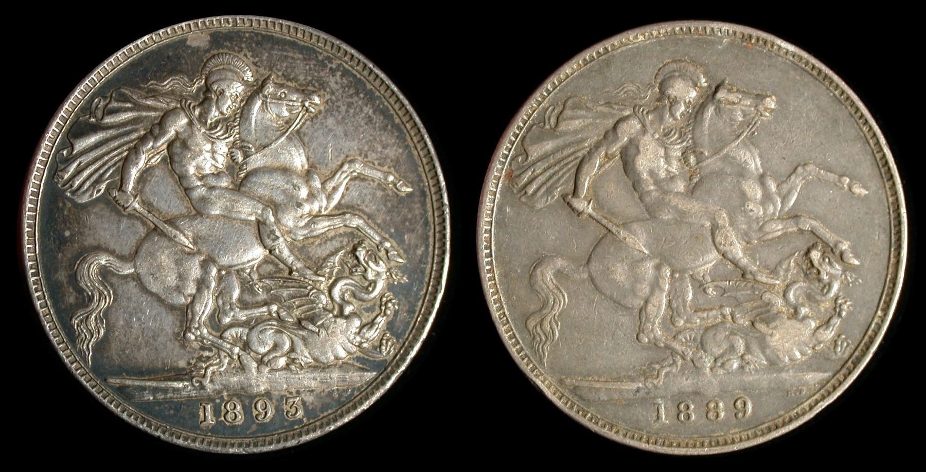 1889 Crown, Jubilee Bust, VF with rim-nicks; together with an 1893 Crown, old Veiled Bust left, "LVI" on edge, AU. (Lot of 2 coins)
