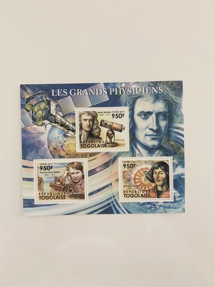 2011 Togo Great Physicists (Les Grands Physiciens) Commemorative Souvenir Set of 3 950F Stamps. Featuring Isaac Newton, Thomas Alva Edison and Nicolaus Copernicus.