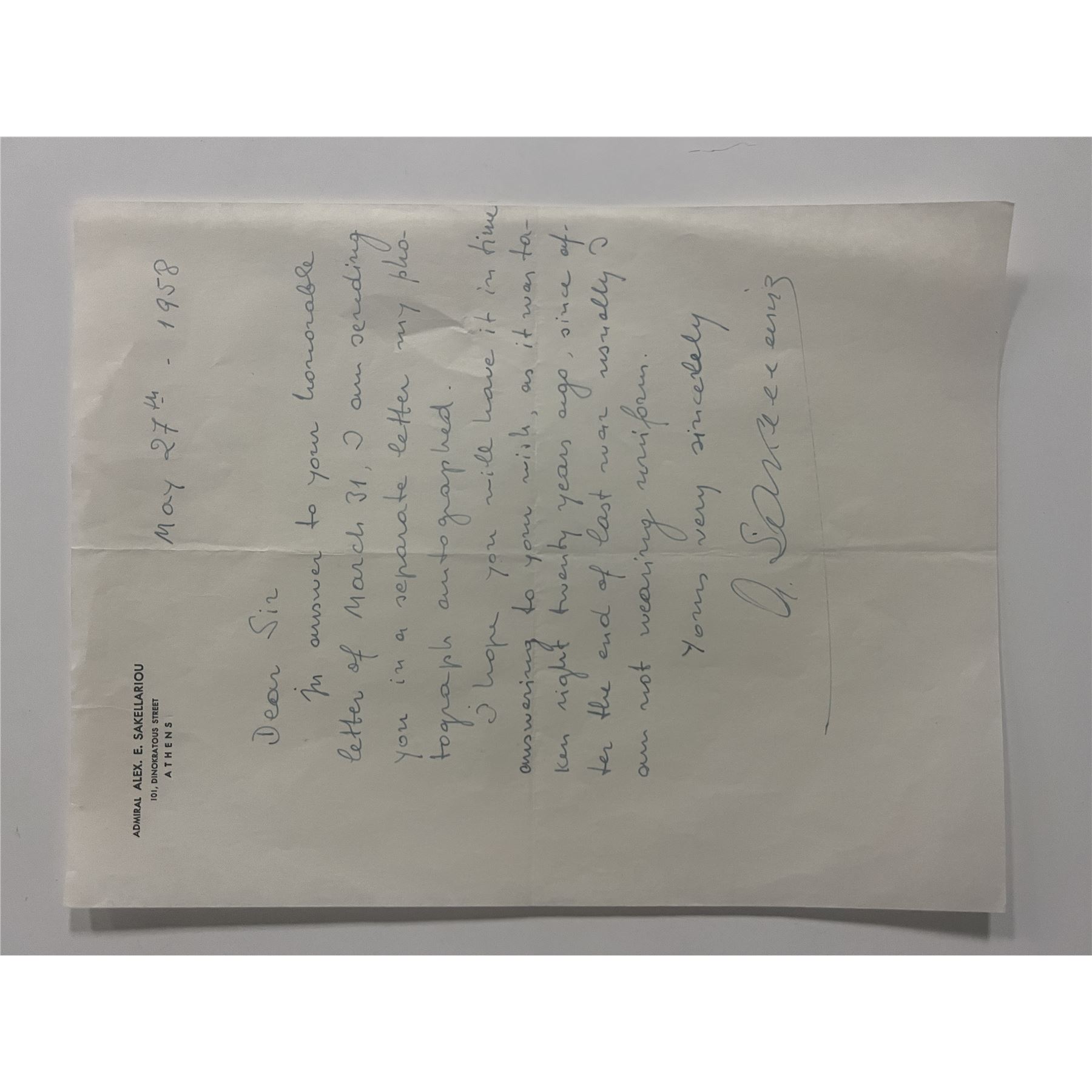 Greek Navy Admiral Alex E. Sakellariou signed 1958 letter. 8x10 inches