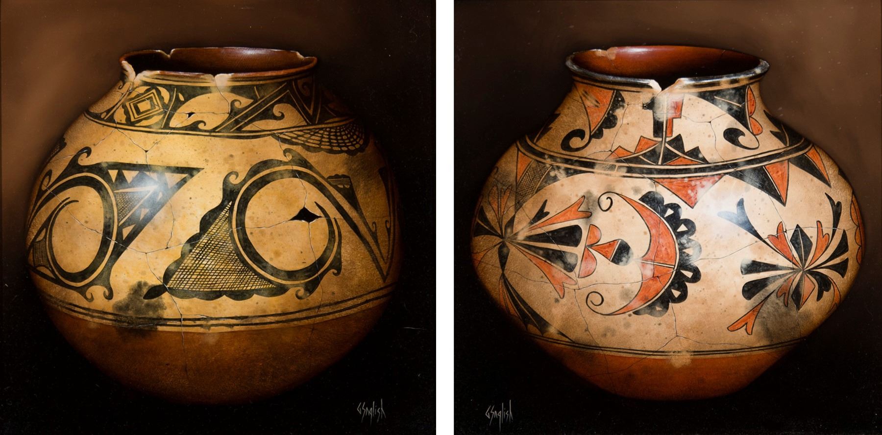 Artist: Greg English; Title: Set of Two: San Ildefonso Pot (2); Medium: Oil on board; Dimensions: Set of two (2): 12 x 12 inches each; Signed: Signed lower left, Signed lower right; Framed/Base: 18 x 18 inches (each)