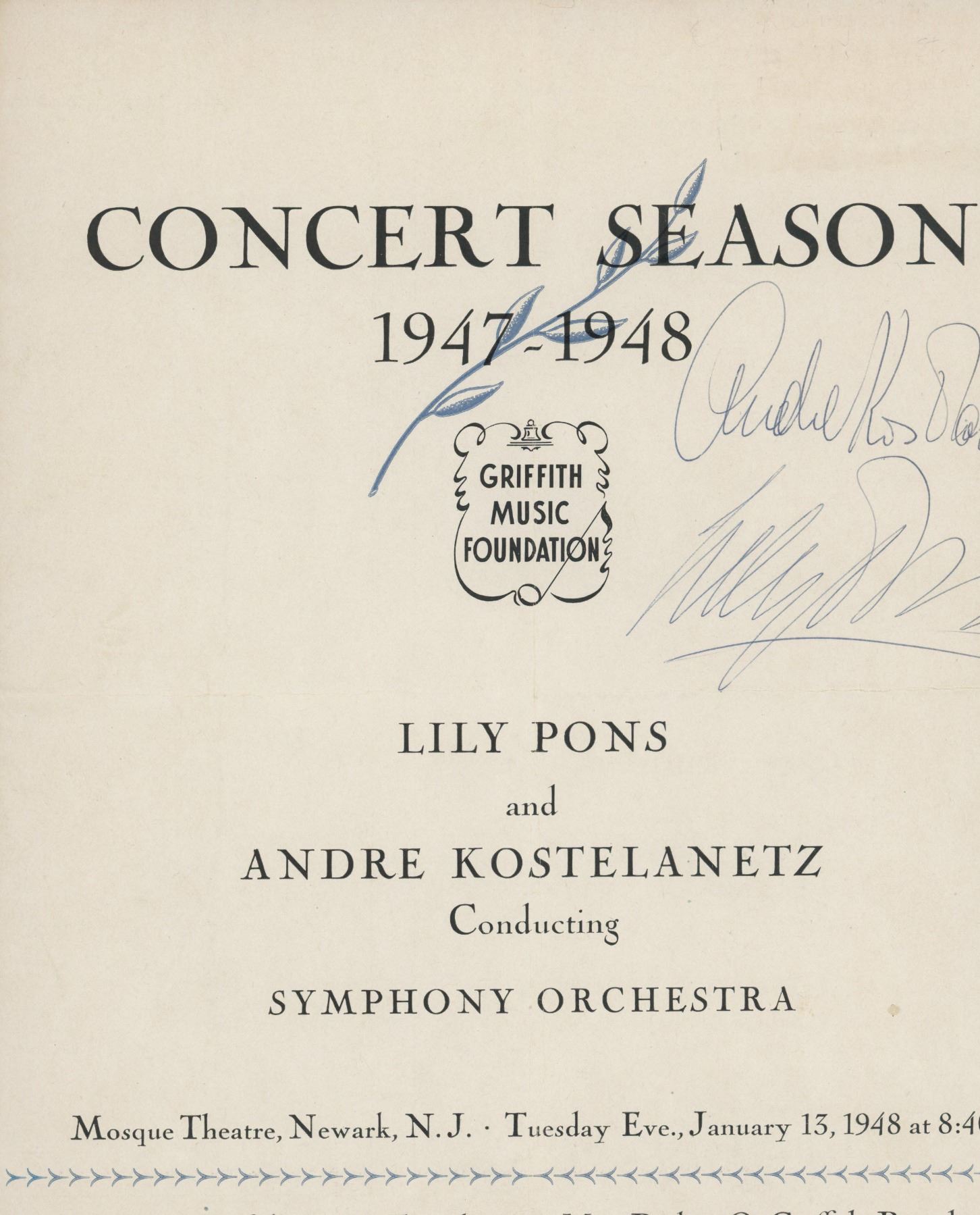 Griffith Music Foundation signed program 1947-1948 autographed by Lily Pons and Andre Kostelanetz