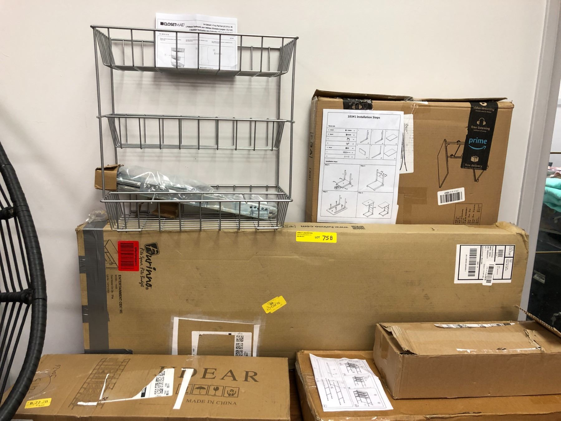 Group Lot of Home Items - Closetmaid pullout wire shelving, TV or Bedside Tray, Entertainment Centre, Shelving with wire racks and shoe rack