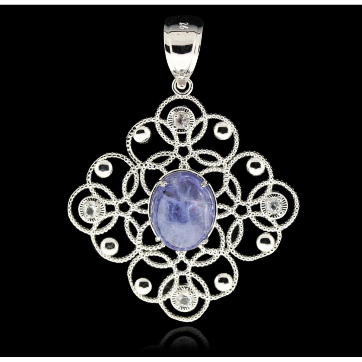 SILVER 4.20ct Tanzanite and White Topaz Pendant Without Chain SLV275. Good Condition! HC802PM. One 925 silver tanzanite and white topaz pendant containing: one cabochon tanzanite measuring 10.10 x 8.20 x 5.30mm. Carat weight is 4.20cts., clarity is heavily included, color is grayish bluish violet. This pendant also includes 4 round white topaz measuring 2.10 x 2.00 x 1.33mm. Carat weight is 0.25cts., clarity is eye clean, color is slightly grayish white. Total weight of gemstone: 4.45cts., total weight of item: 4.40 grams. AIG appraised at $605.00.