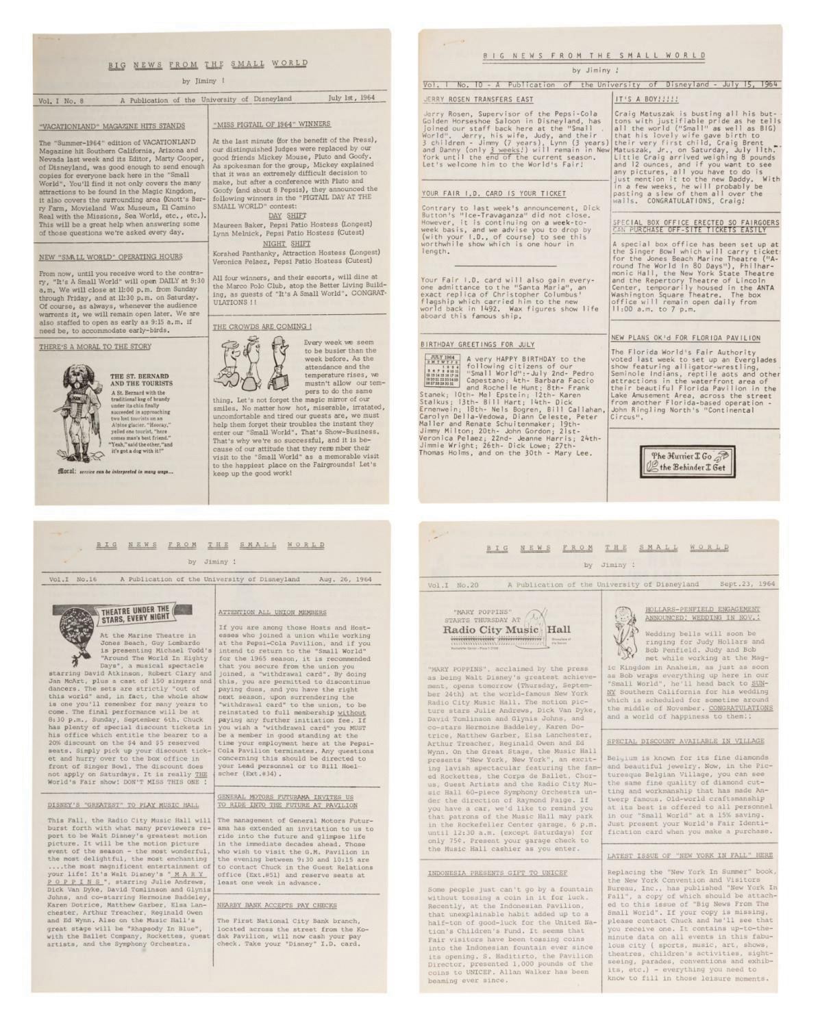 (Disney, 1964) A collection of (4) "Big News from the Small World" Newsletters prepared by the University of Disneyland for Cast Members serving as Disneyland ambassadors during the 1964 season of the New York World's Fair. The periodical kept "Disneylanders" well informed of Walt Disney Productions and Disneyland developments as well as discounts and Fairground news from July to September of 1964. Measuring 8.5"x11" the (11) total pages are in very good condition with slight wear from staples to corners and edges.