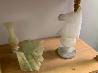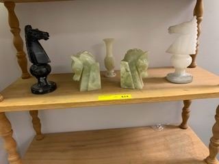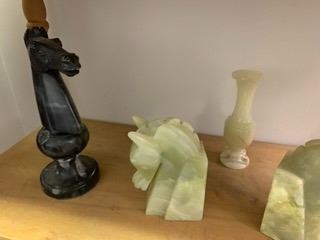 Group of Assorted Stone Figures - Two Large White and Black Chess Pieces, two Horsehead Bookends and one Vase - largest is 9in tall