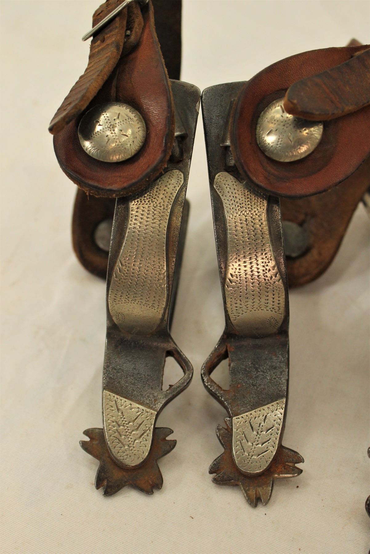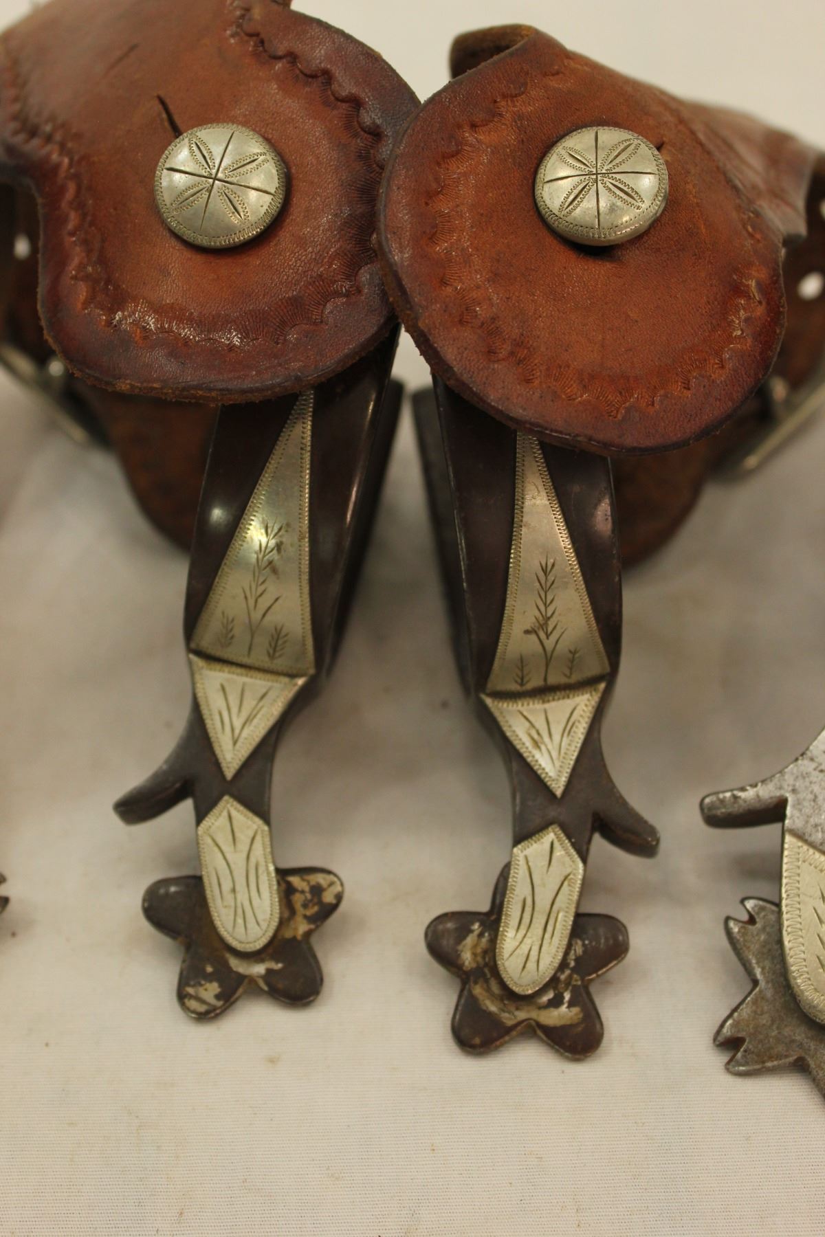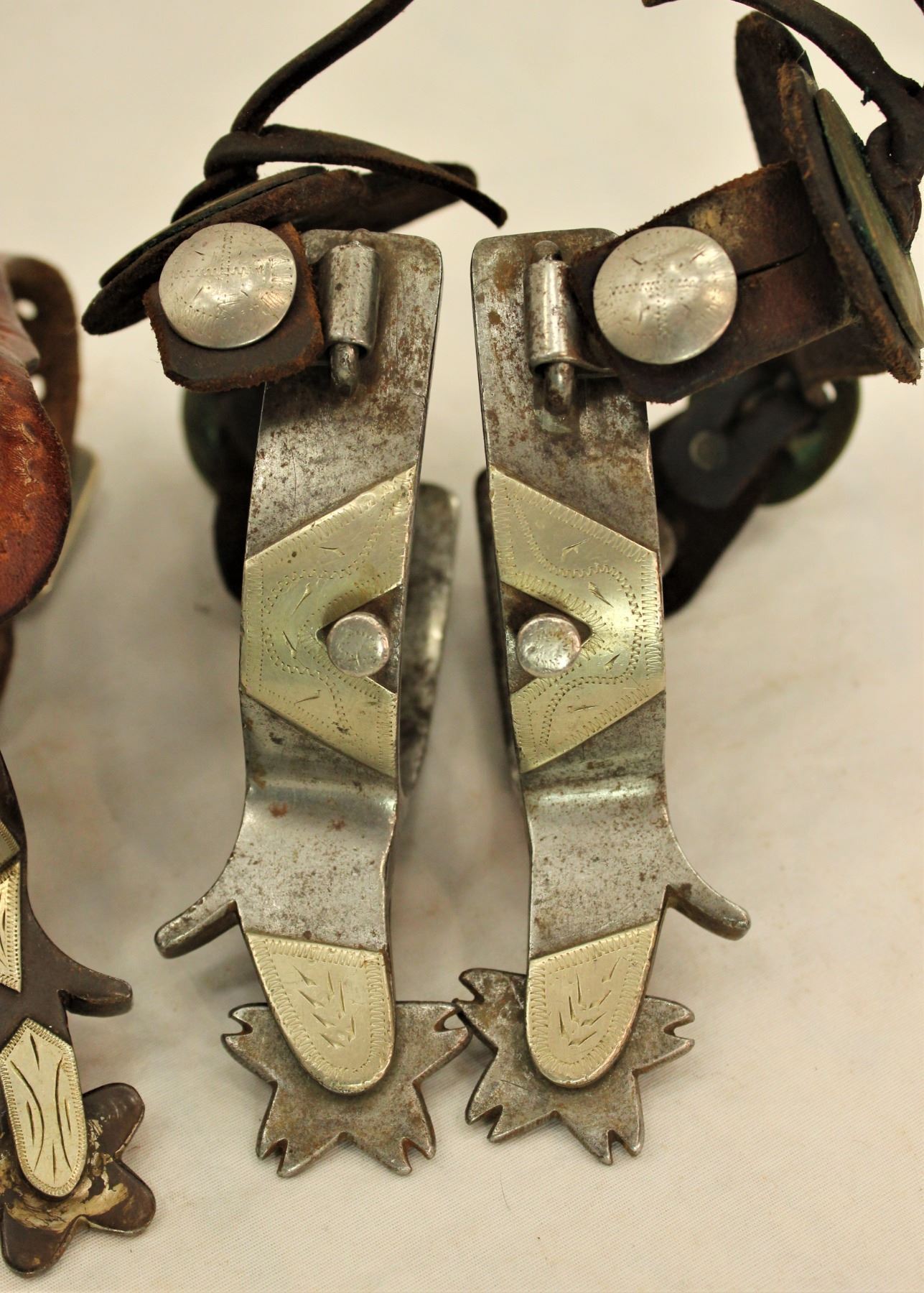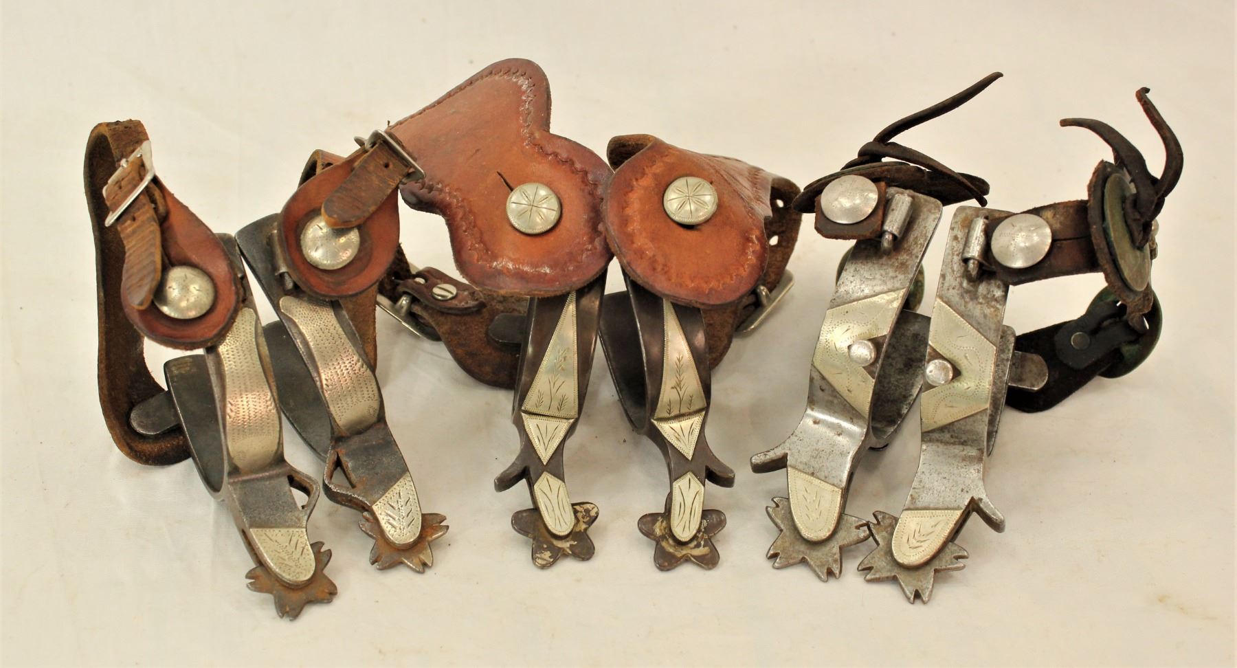 Three nice pairs of Crockett spurs with period straps, to include fish and Paddy Ryan style patterns. Al in nice condition.