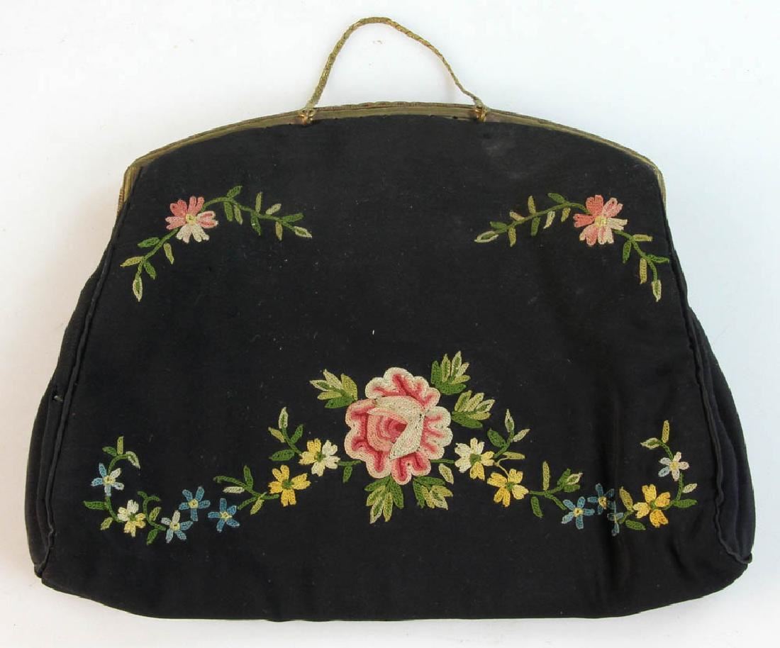 Group of six ladies purses, including mesh, rhinestones, needlework, cut steel, one by Whiting, also included a lace fan with sequins, largest bag is 5 5/8" H x 8" W.