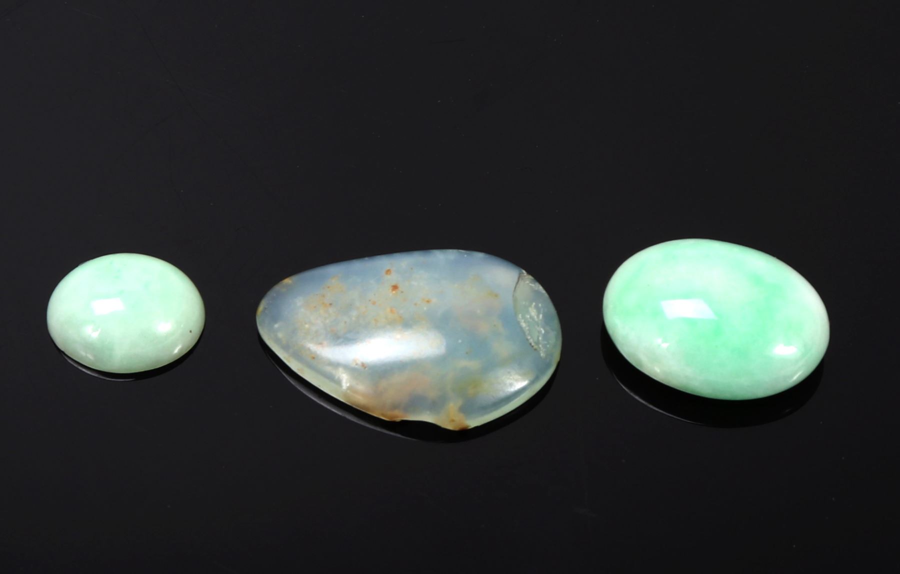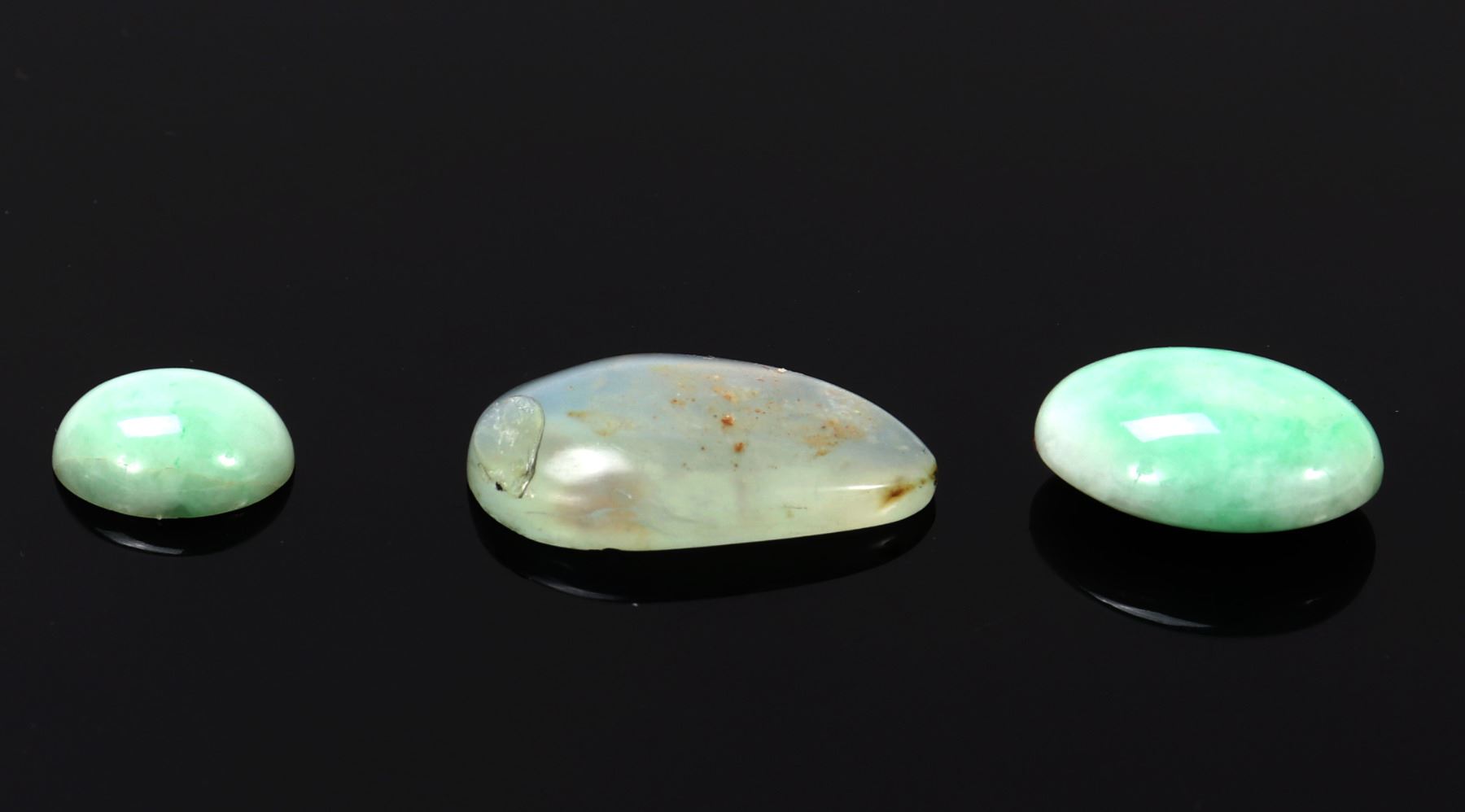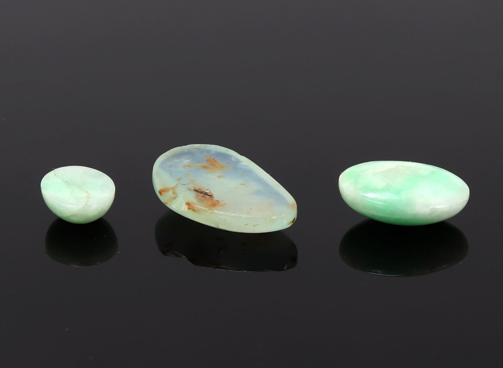 Chinese hardstone pendants and precious gems for rings, bracelets or earrings. Opal like stone in the center with pairs of light green pendants to the sides. Size 3/4" L. Condition: Minor loss to biggest pendant.