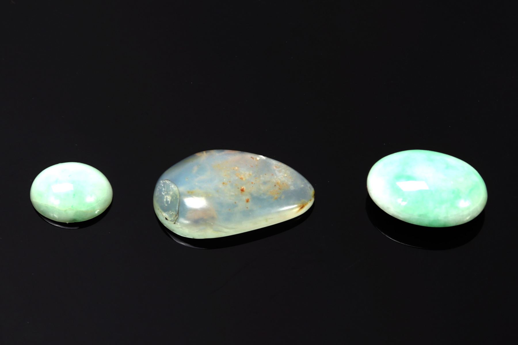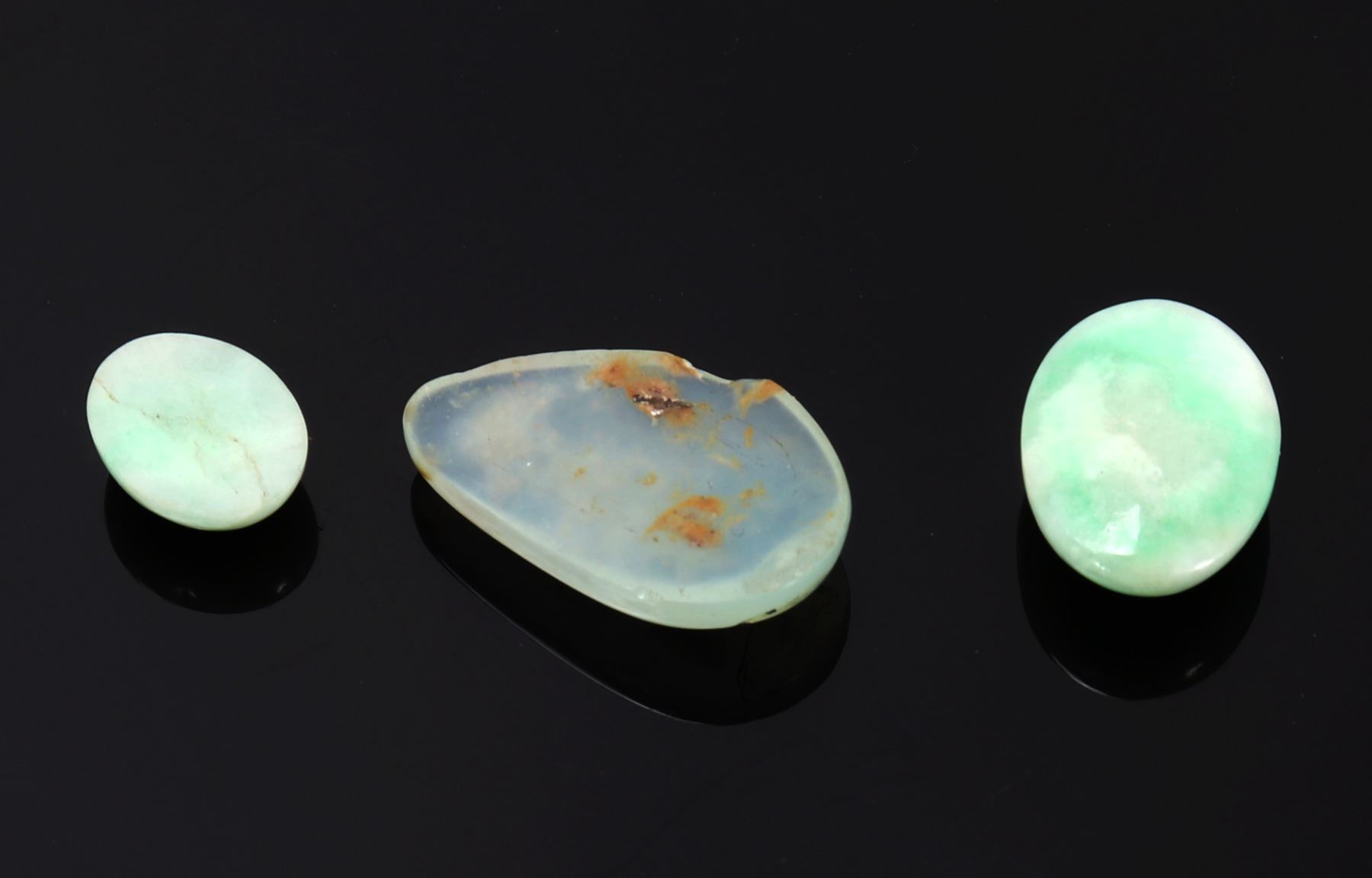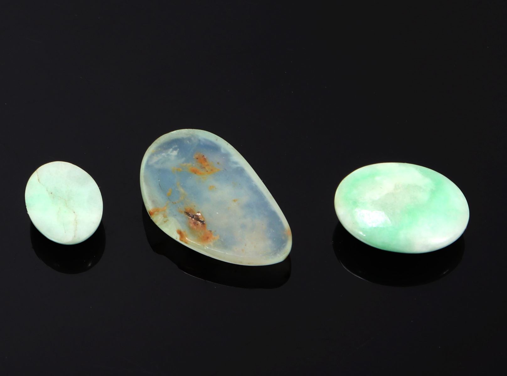 Chinese hardstone pendants and precious gems for rings, bracelets or earrings. Opal like stone in the center with pairs of light green pendants to the sides. Size 3/4" L. Condition: Minor loss to biggest pendant.