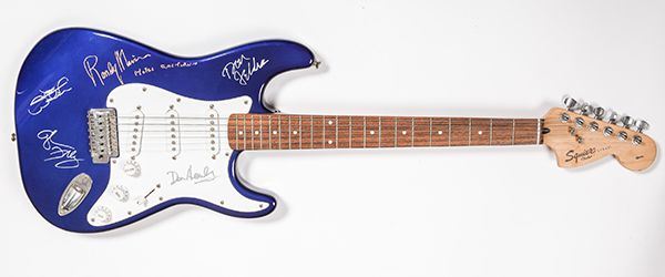 Guitar Signed By Members of the Eagles. Electric blue and white Fender Squier Strat signed by DON HENLEY, RANDY MEISNER, JOE WALSH, GLENN FRAY, and DON FELDER. All signed in silver marker except for Randy Meisner, who also wrote "Hotel California" below and to the right of his name.