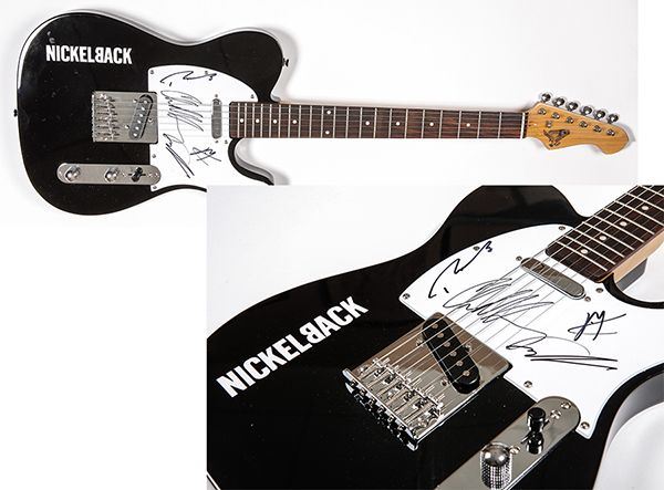 Guitar Signed By Nickelback. Black and white S10 guitar with "NICKELBACK" in white lettering, signed by CHAD KROEGER, RYAN PEAKE, MIKE KROEGER, and DANIEL ADAIR. With a couple of photos from 2007. The Canadian band is ranked as the second best-selling foreign group in the U.S.