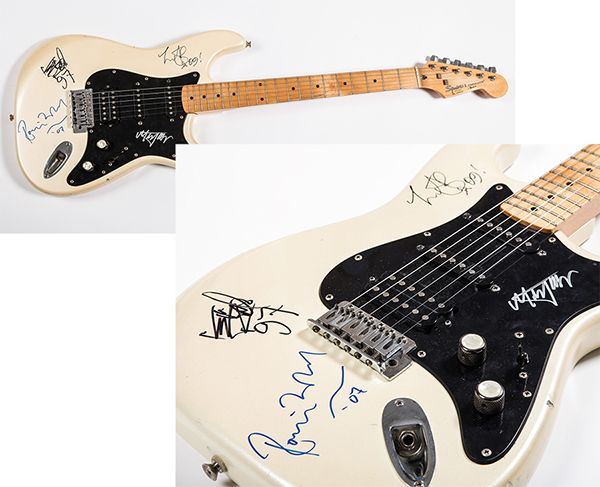 Guitar Signed By the Rolling Stones. Fender Squier II Stratocaster signed by MICK JAGGER in silver marker on the black pickguard, with no date; KEITH RICHARDS, RONNIE WOODS, and CHARLIE WATTS signed on the pale lemon body. Richards signed with black marker and put the date "97" under his name; Ronnie Woods signed in blue marker and put the date "'07" under his name; and Charlie Watts signed in black marker and put "09!" by his name. Guitar has a few dings around the edges.