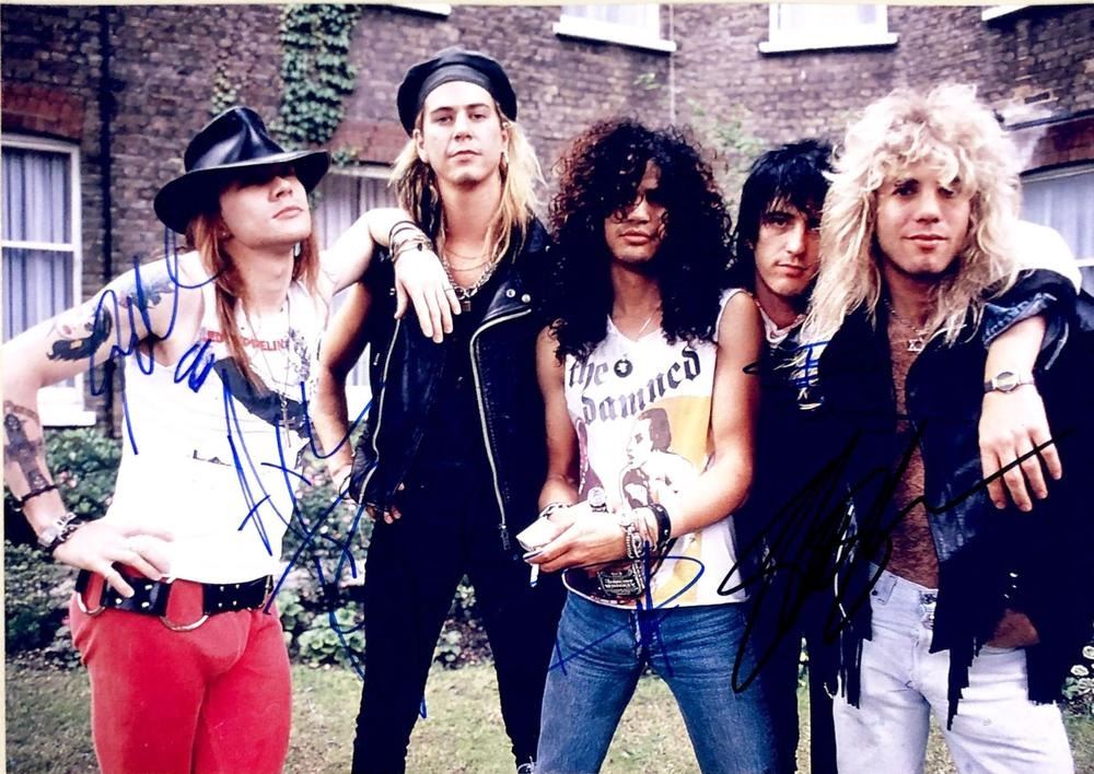 Guns N' Roses facsimile signed photo autographed by Axl Rose, Slash, Izzy Stradlin, Duff McKagan, and Steven Adler. 8x10 inch.