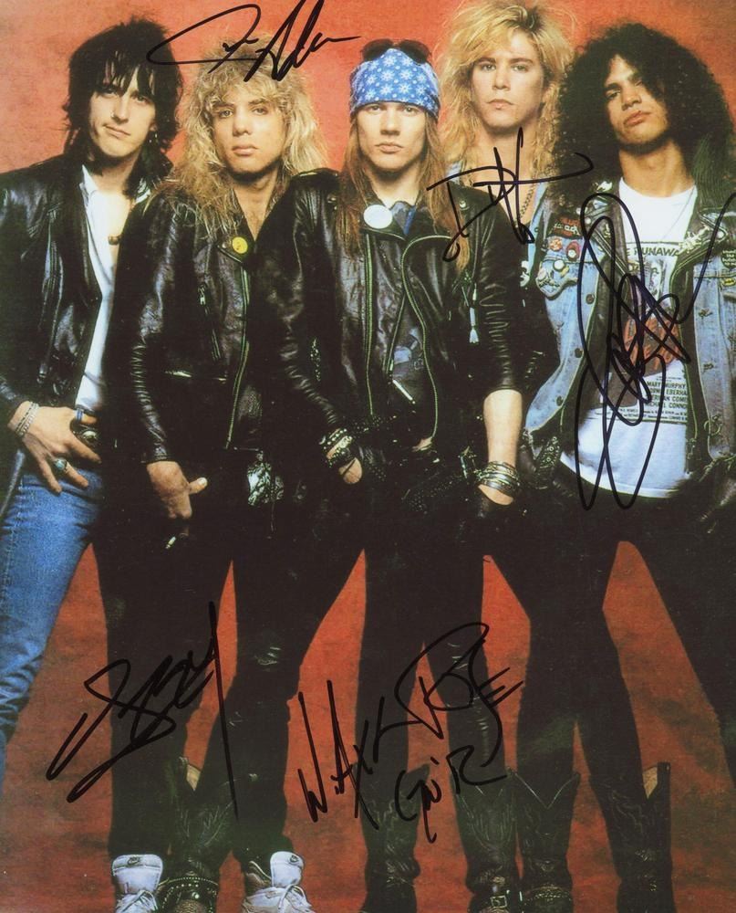 Guns and Roses signed photo autographed by Axl Rose, Slash, Izzy Stradlin, Duff McKagan, Steven Adler. 8x10 in. This item is a reprint of an original autograph