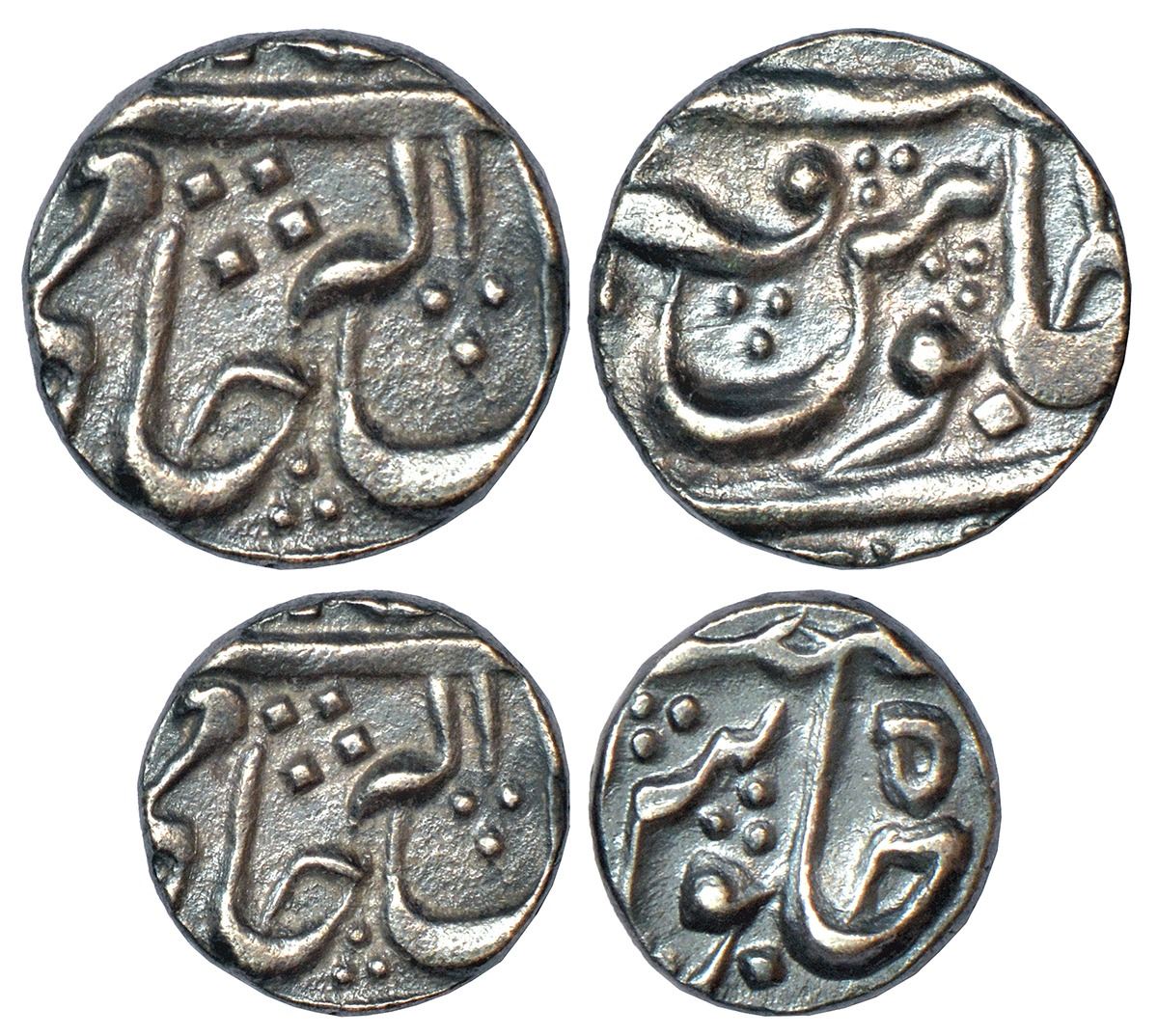 Gwalior, Madho Rao (1886-1925 AD), silver coins (2), ¼ rupee, 2.74g and 1/8 rupee, RY 5x, 1.42g, Dar ul-Fath Ujjain mint (off flan), in the name of Shah Alam II. (2 coins)