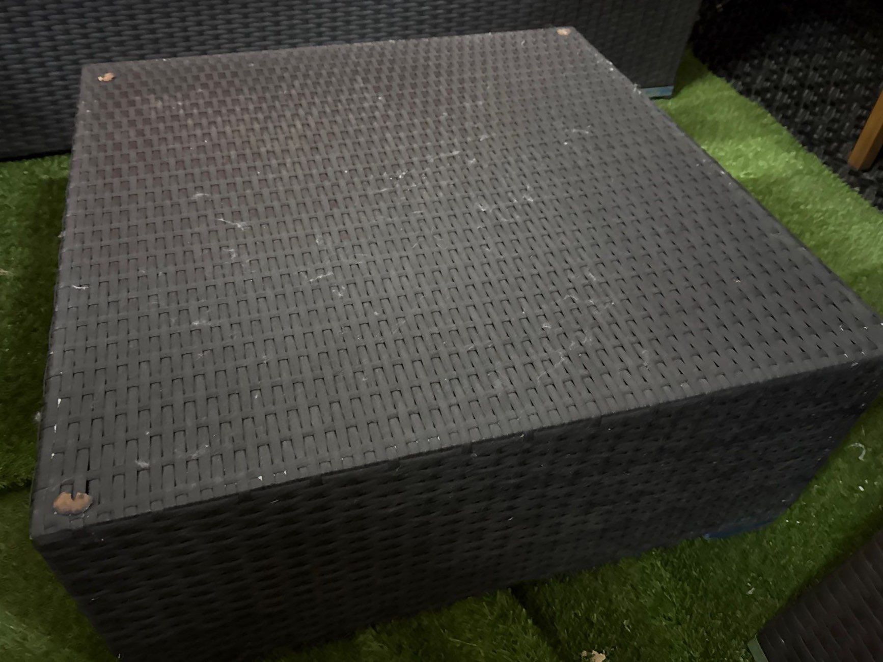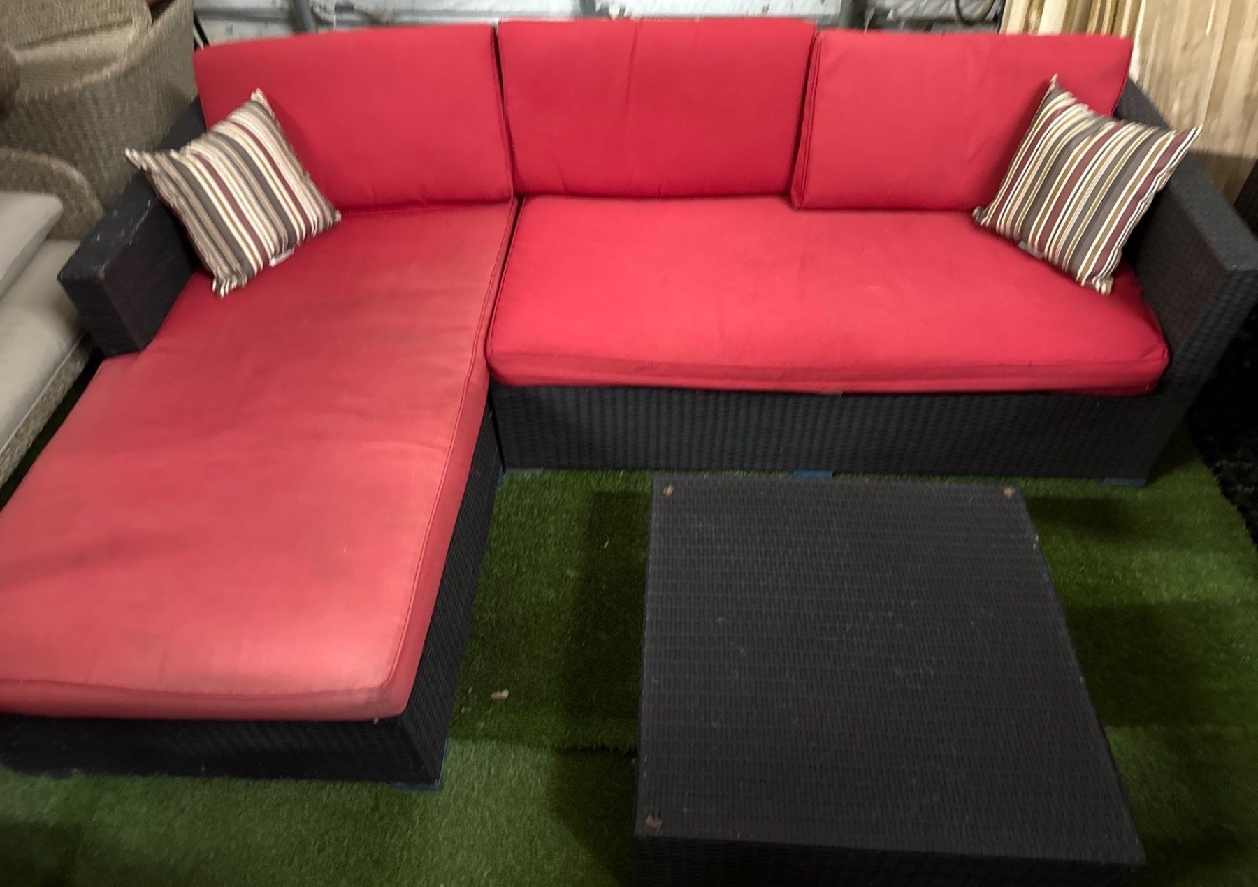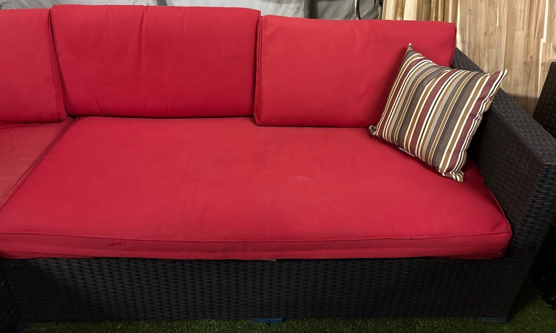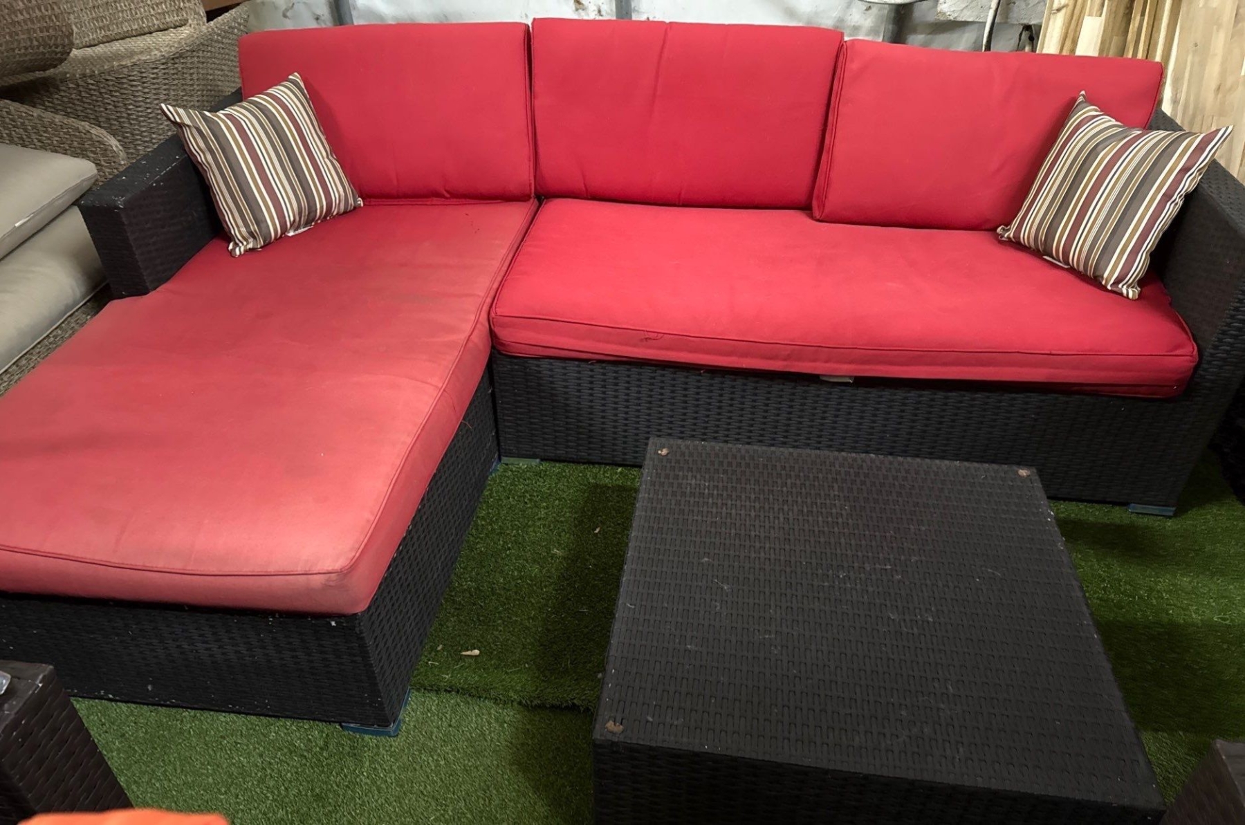 Gymax 5-Piece Rattan Patio Conversation Outdoor Set w/ Red Cushions & Wicker Coffee Table (Missing Glass Top)