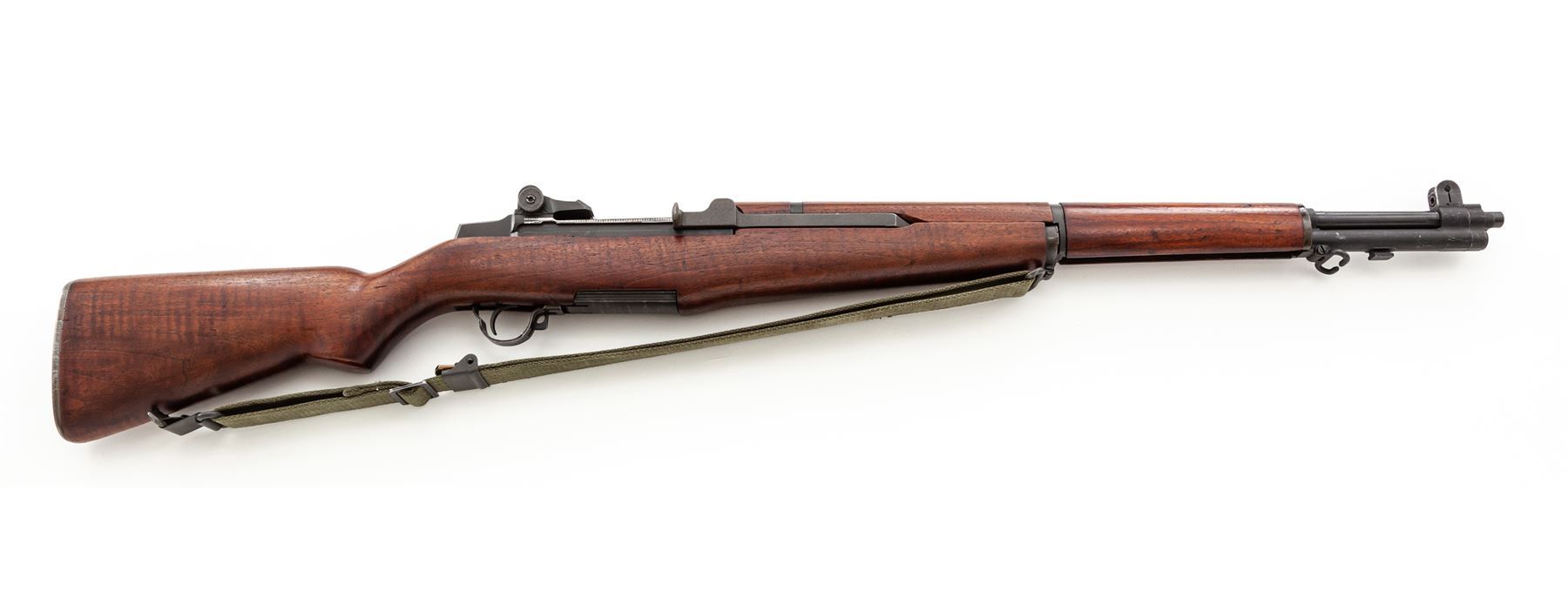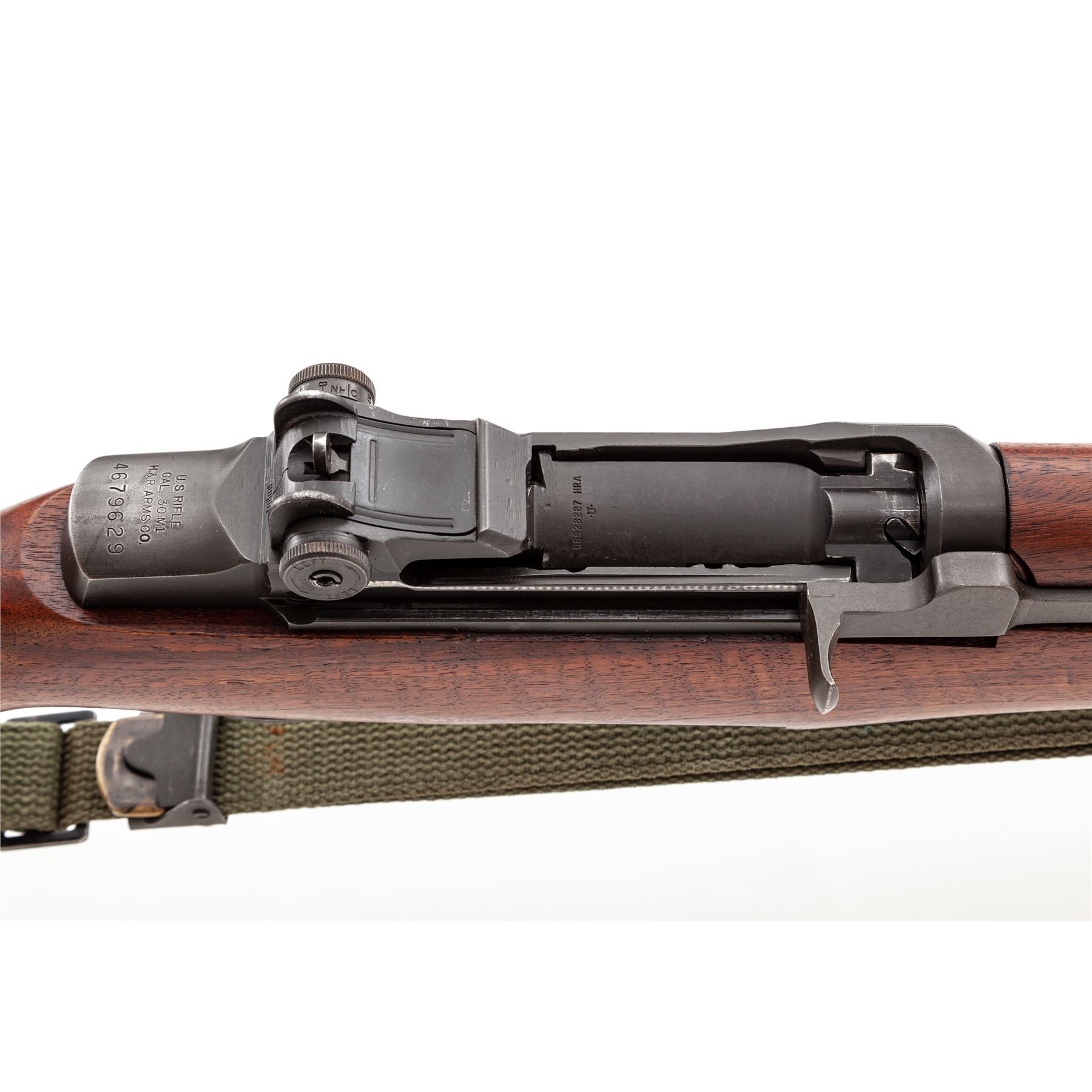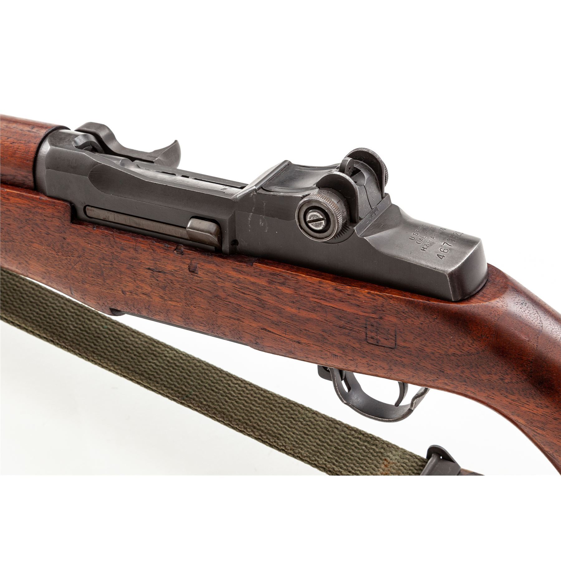 H&R M1 Garand Semi-Automatic Rifle, #4679629, .30-06 cal., 24'' barrel, parkerized finish, walnut stock, blade front sight with protecting ears and adjustable aperture rear sight. Marked on receiver tang ''U.S. RIFLE CAL. .30 M1 H&R ARMS CO.''. Barrel stamped ''HRA 10-53''. Bolt, trigger housing, hammer, and operating rod all stamped ''HRA''. Stock is stamped on left side with a Defense Dept. cartouche and a ''circle P'' firing proof on underside of wrist. Condition overall is very good with over 90% finish remaining on the metal. Wood is very good with light applied finish over old handling marks. Action is smooth, bore is excellent with sharp rifling. Includes a U.S.G.I. green cotton sling in good condition. Est.: $1,000-$1,500. (C&R)