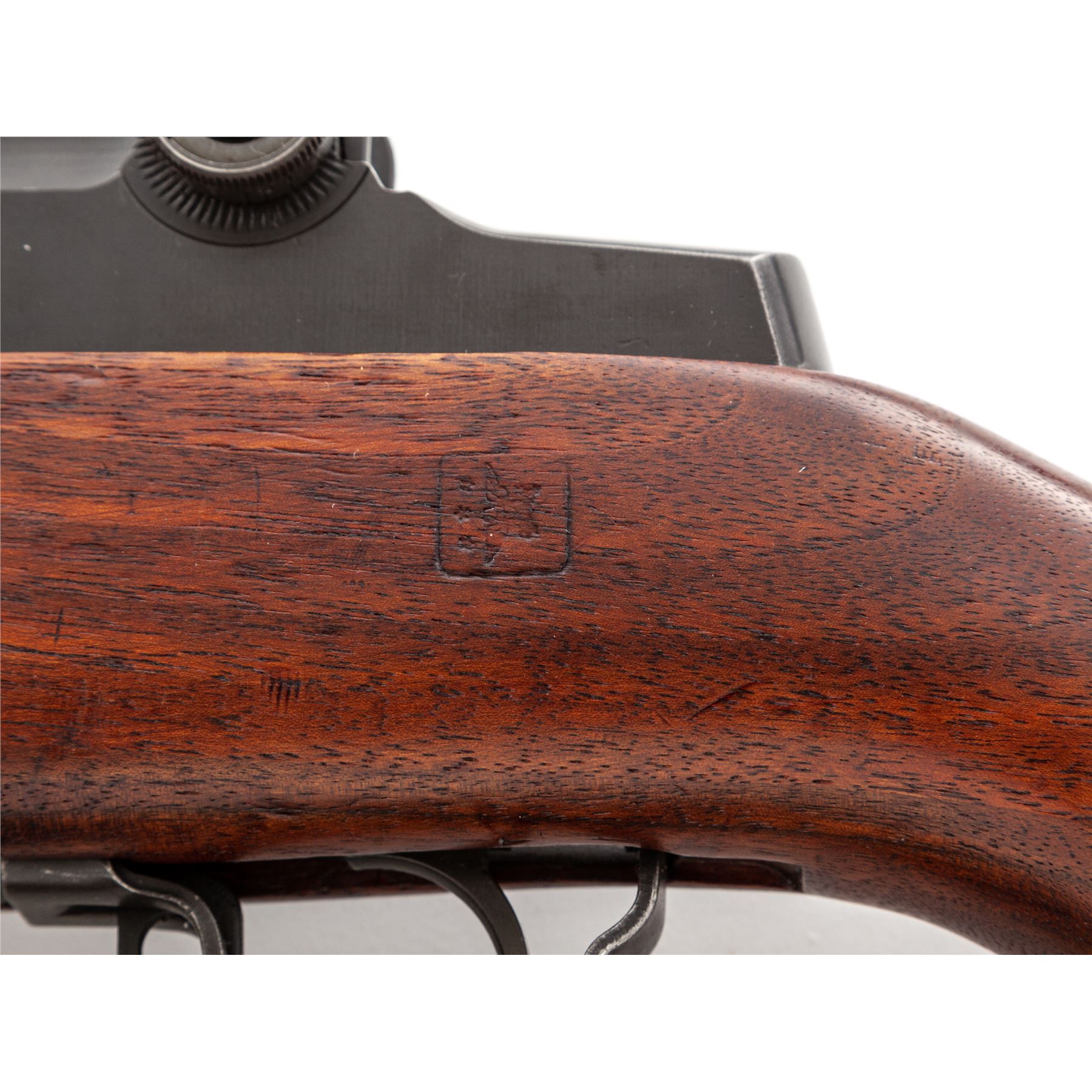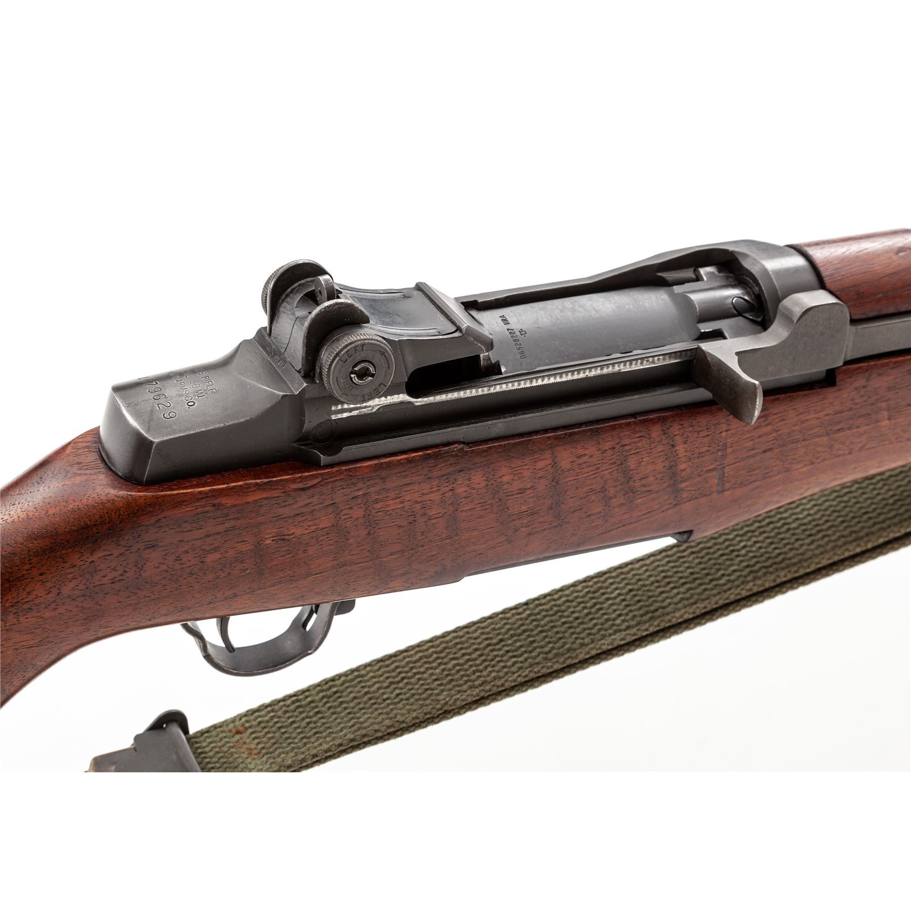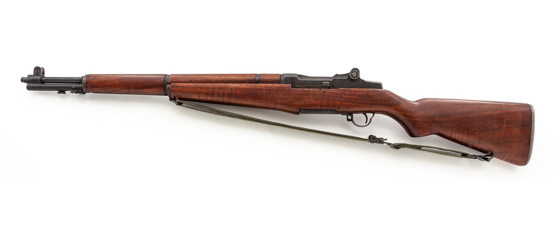H&R M1 Garand Semi-Automatic Rifle, #4679629, .30-06 cal., 24'' barrel, parkerized finish, walnut stock, blade front sight with protecting ears and adjustable aperture rear sight. Marked on receiver tang ''U.S. RIFLE CAL. .30 M1 H&R ARMS CO.''. Barrel stamped ''HRA 10-53''. Bolt, trigger housing, hammer, and operating rod all stamped ''HRA''. Stock is stamped on left side with a Defense Dept. cartouche and a ''circle P'' firing proof on underside of wrist. Condition overall is very good with over 90% finish remaining on the metal. Wood is very good with light applied finish over old handling marks. Action is smooth, bore is excellent with sharp rifling. Includes a U.S.G.I. green cotton sling in good condition. Est.: $1,000-$1,500. (C&R)