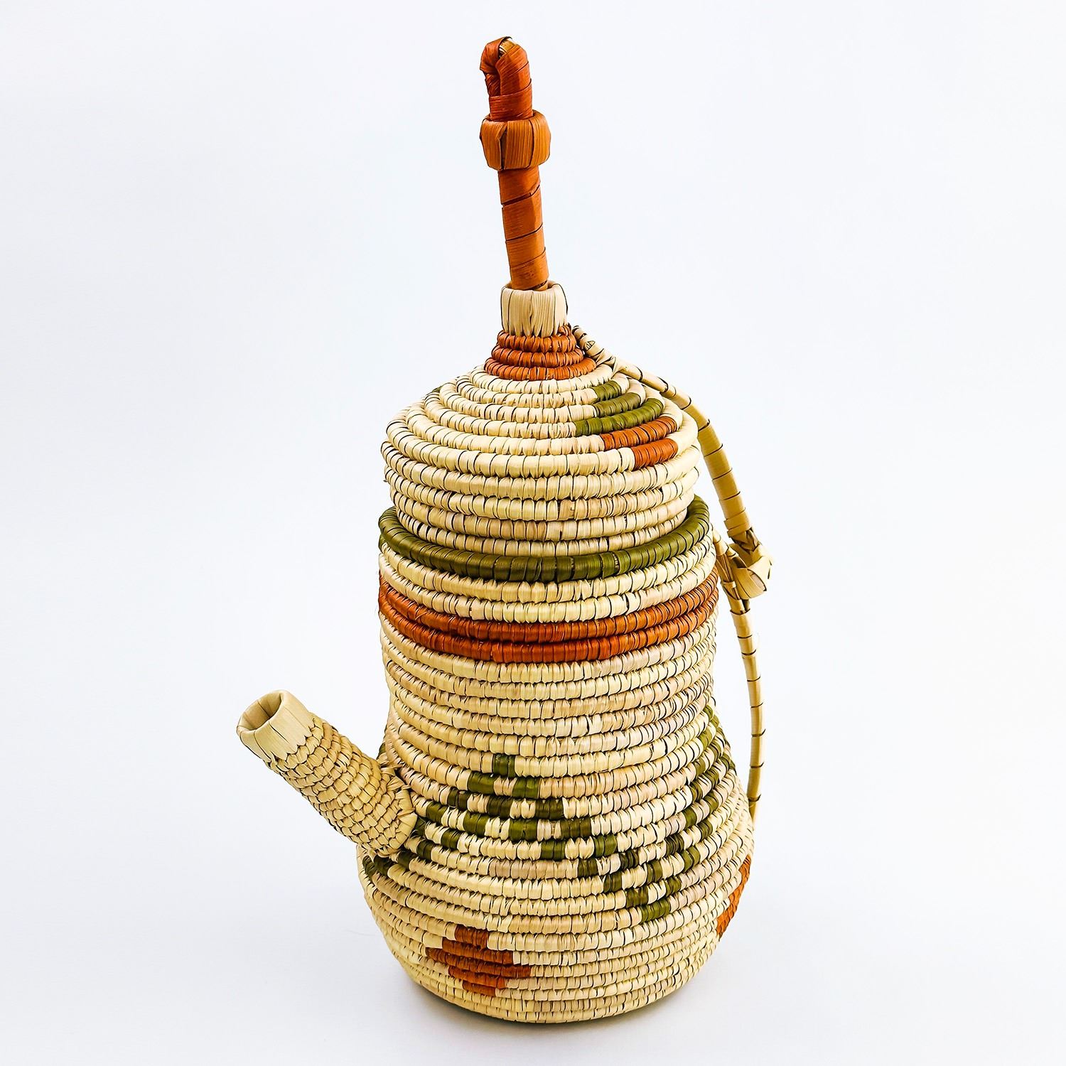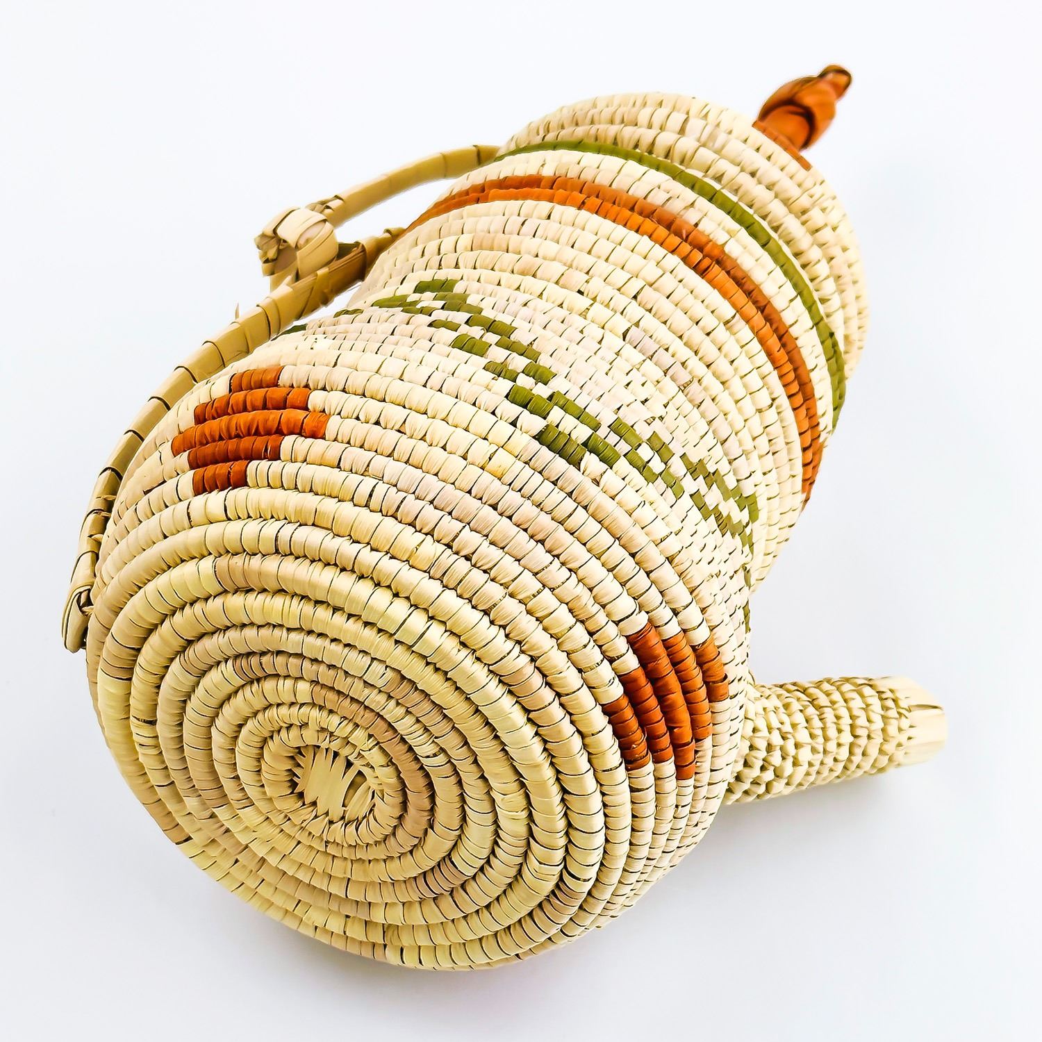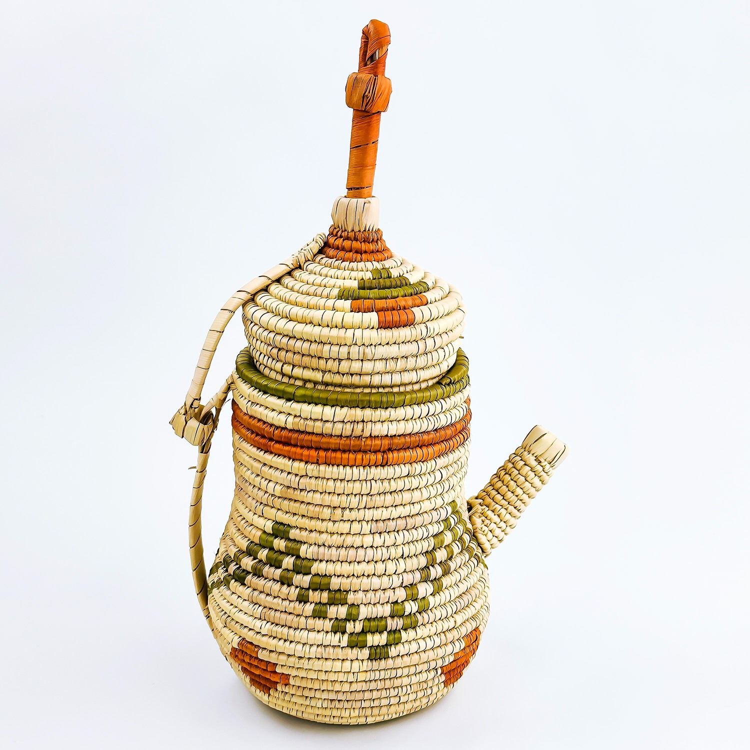#8097 - HAND CRAFTED COUNTRY HOME DECOR BASKET SCULPTURE - ORIGIN UNKNOWN. MEASURES: 12.5” (32 CM) HIGH BY 7.5” (19 CM) WIDE - INCLUDES SPOUT AND HANDLE.